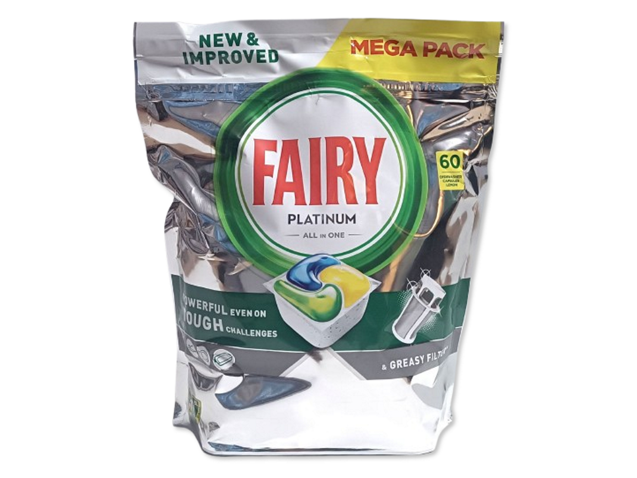 Tabletki do zmywarki Fairy Platinum All In One o zapachu cytrynowym to wielofunkcyjne kapsułki pakowane w szczelny zgrzewany woreczek ze strunowym zamknięciem.