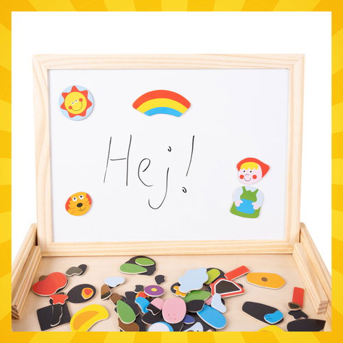 ?? Dwustronna tablica dwa światy zabawy w jednym. Biała, magnetyczna powierzchnia zachęca do układania kolorowych elementów i rysowania pisakiem, a czarna tablica kredowa pozwala tworzyć swobodne, artystyczne rysunki.