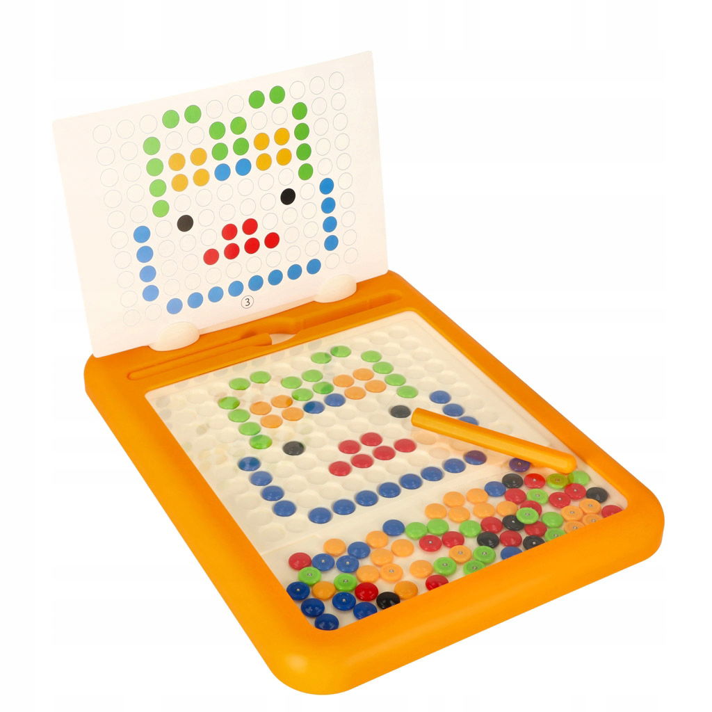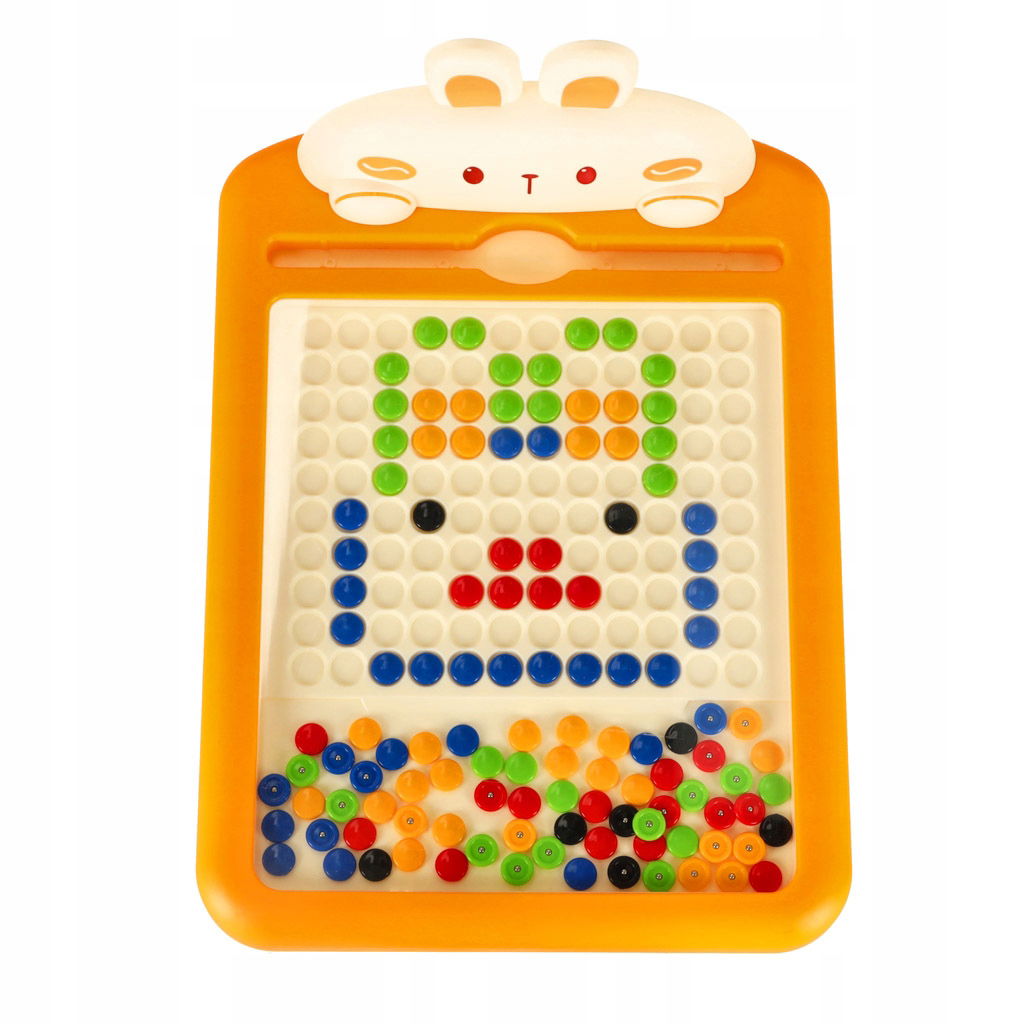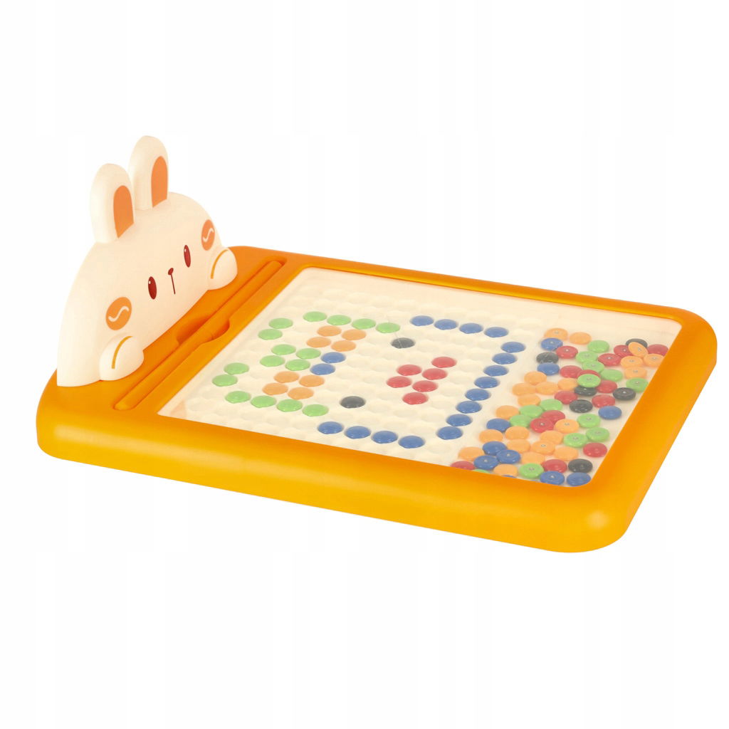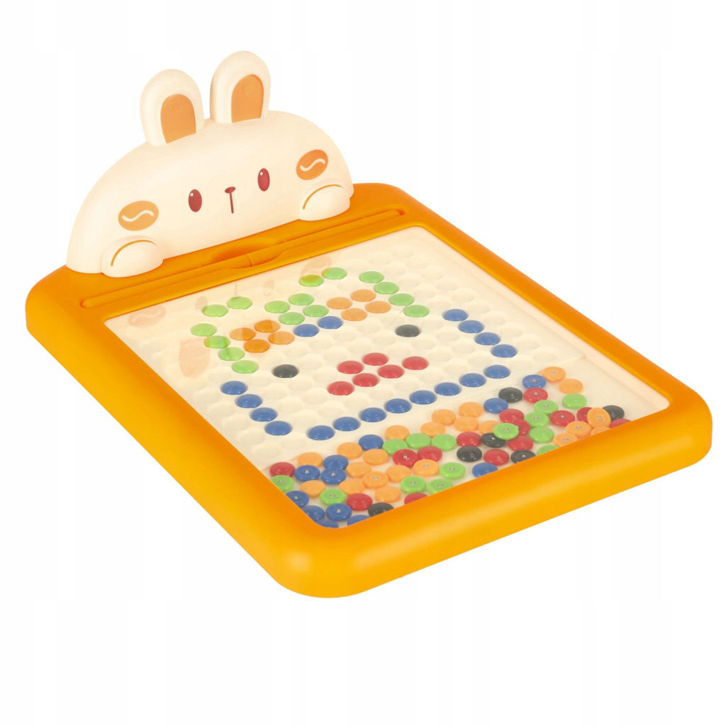 Tablica magnetyczna posiada kolorowe guziki, które można przesuwać przy pomocy magnetycznego długopisu i układać w przeróżne mozaiki, wzory i obrazki. Dziecko może wzorować się na dostępnych przykładach lub samodzielnie wymyślać nowe dzieła. Na tablicy znajduje się króliczek, który będzie towarzyszył maluchowi podczas zabawy.