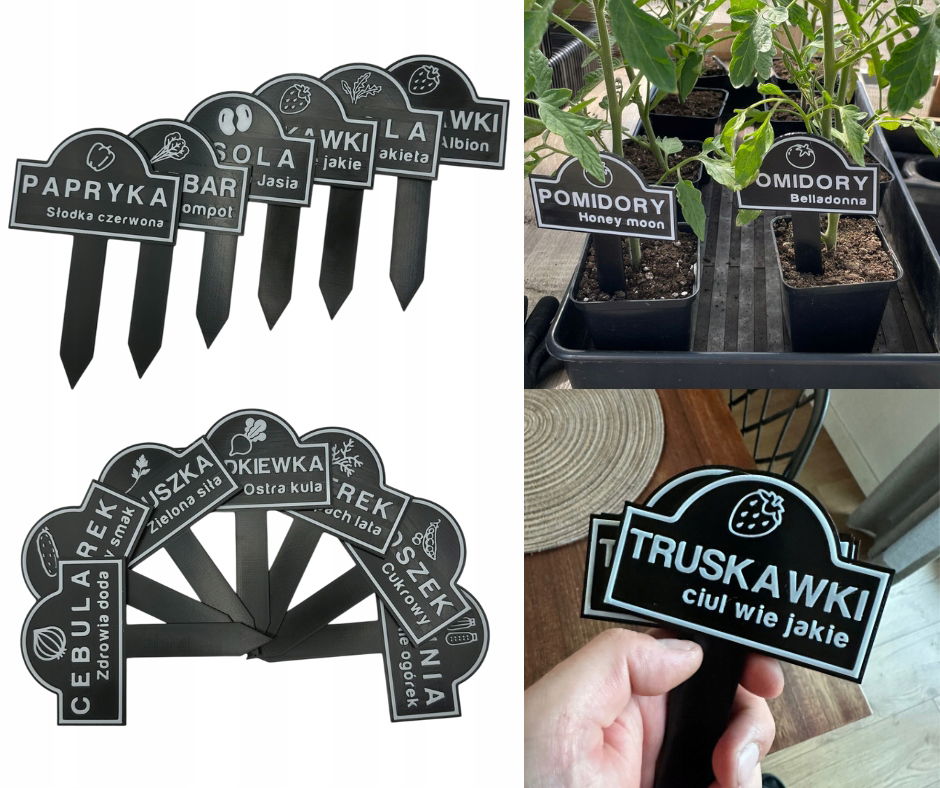 Nasze tabliczki to małe dzieła sztuki. Dzięki precyzyjnemu drukowi 3D, każda tabliczka jest trwała i odporna na warunki atmosferyczne. To, co je wyróżnia, to możliwość pełnej personalizacji! W górnym rzędzie umieścimy nazwę warzywa (np. "Pomidory", "Truskawki", "Rukola"), a w dolnym możesz wpisać cokolwiek tylko zechcesz – nazwę odmiany ("Honey Moon", "Zielona moc"), zabawną frazę ("Dla Jasia", "Słodki korzeń") czy cokolwiek, co sprawi, że Twój ogród będzie jeszcze bardziej wyjątkowy i osobisty. To idealne rozwiązanie dla każdego miłośnika ogrodnictwa, który ceni sobie zarówno funkcjonalność, jak i estetykę. Pamiętaj, aby użyć mniejszej ilości znaków - wówczas tabliczka wygląda estetycznie.