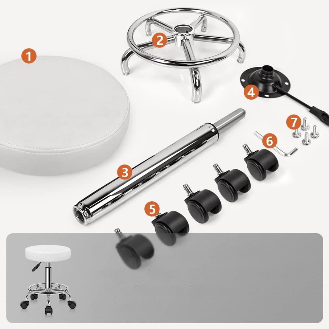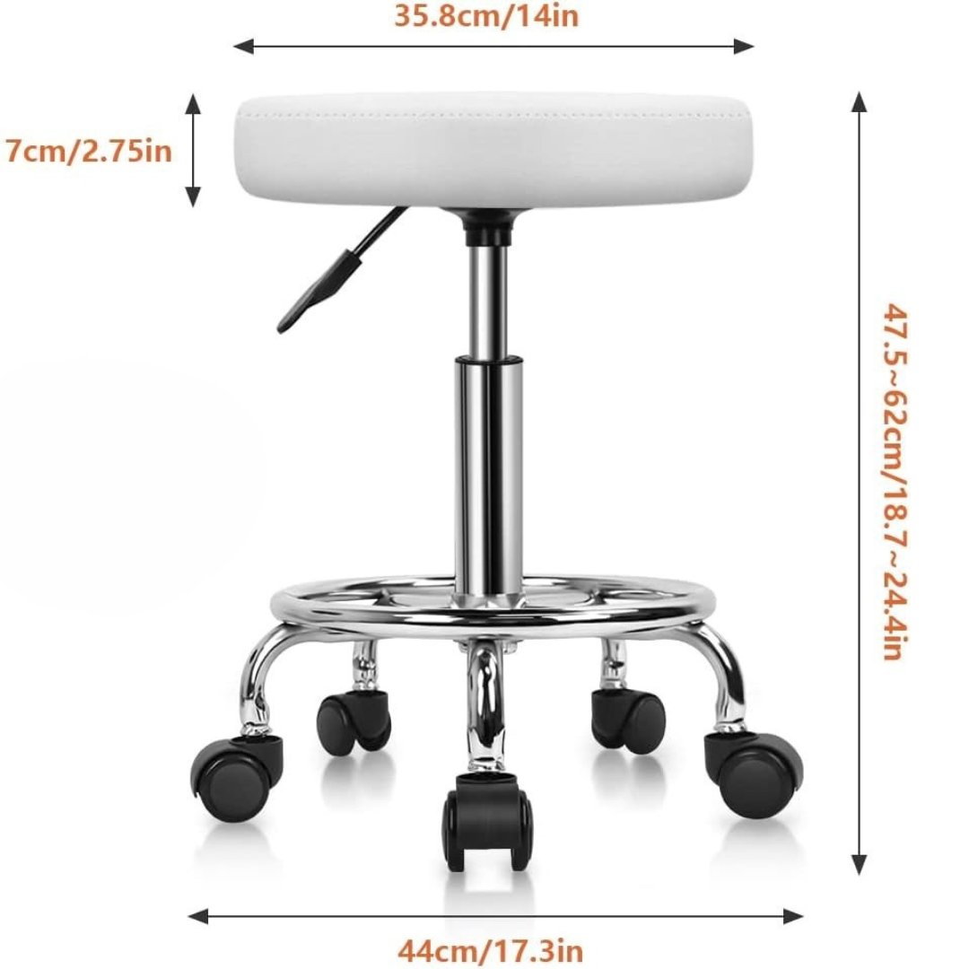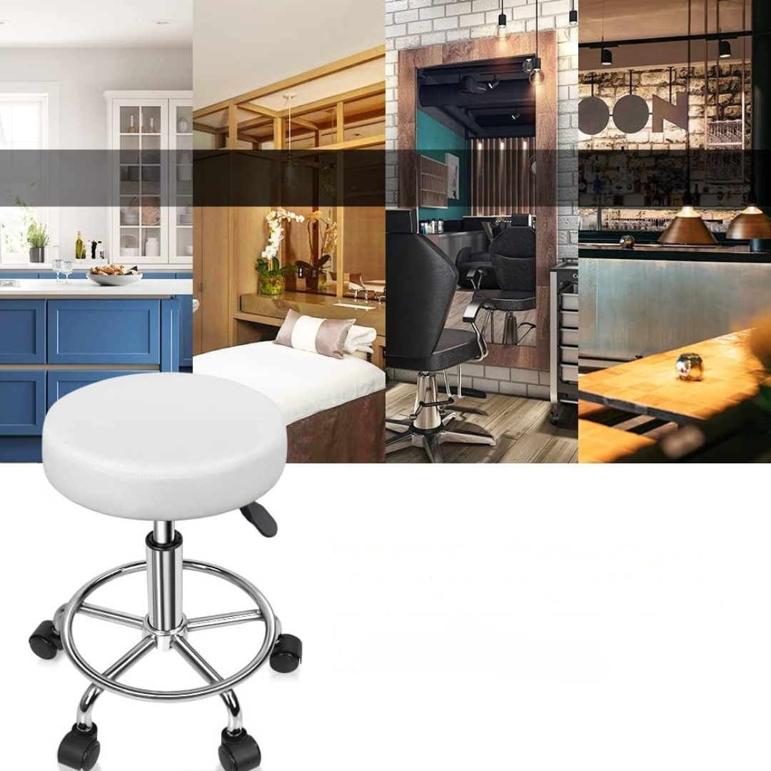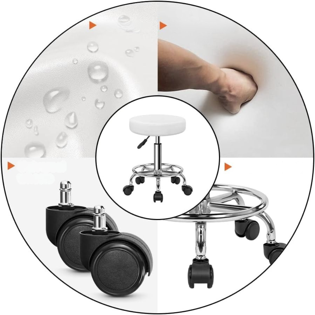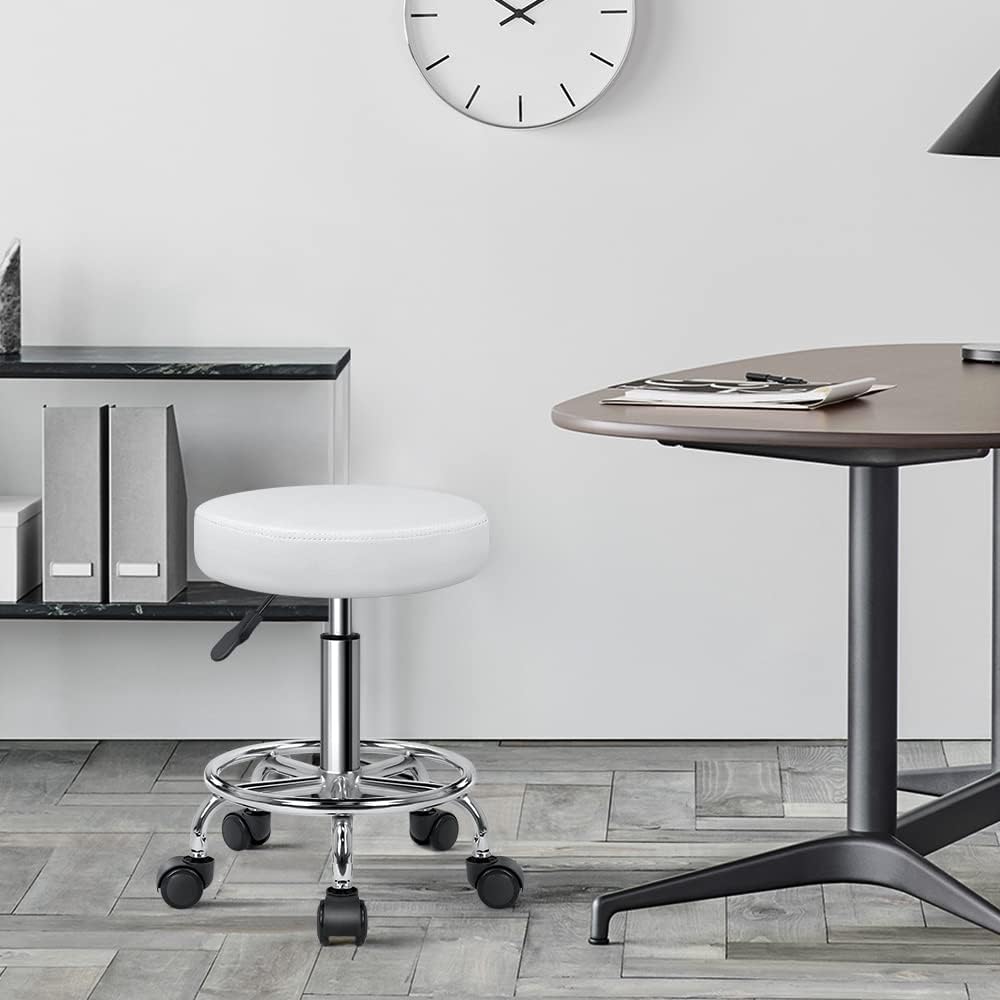 KKTONER PU Skórzany okrągły taboret na kółkach z podnóżkiem, z regulacją wysokości, obrotowy - do spa, salonu tatuażu, biura, masażu, pracy - poduszka 14 cali (biały).