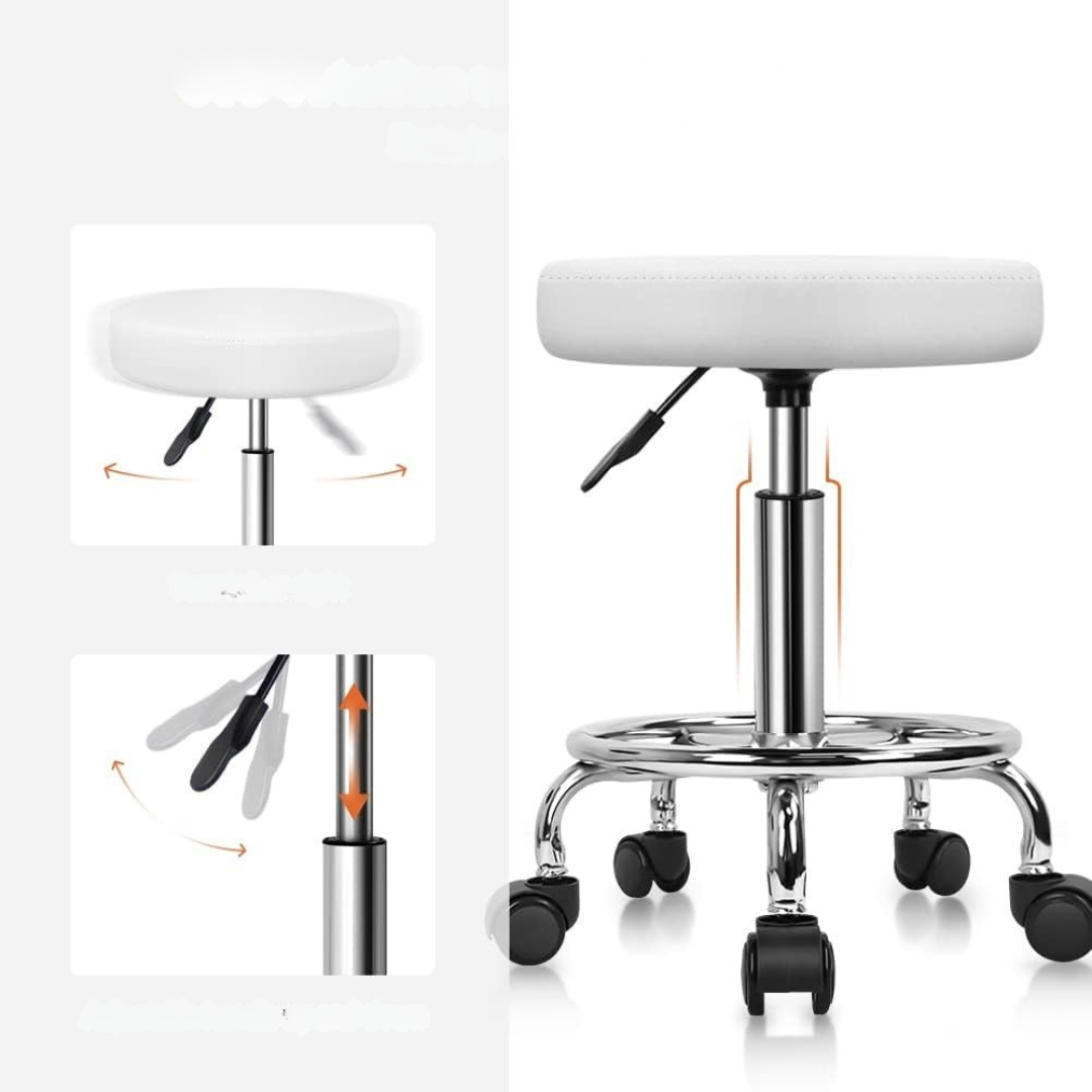 - Zastosowanie: taboret przeznaczony do użytku w salonach fryzjerskich, spa, biurach, kawiarniach, pubach i domach, gdzie wymagana jest mobilność i wygoda podczas pracy lub odpoczynku. Dzięki regulacji wysokości i obrotowemu siedzisku sprawdza się w czynnościach wymagających elastyczności, takich jak szkicowanie, masaż czy stylizacja. Może być także używany jako wygodne siedzisko w miejscach o nowoczesnym wystroju.