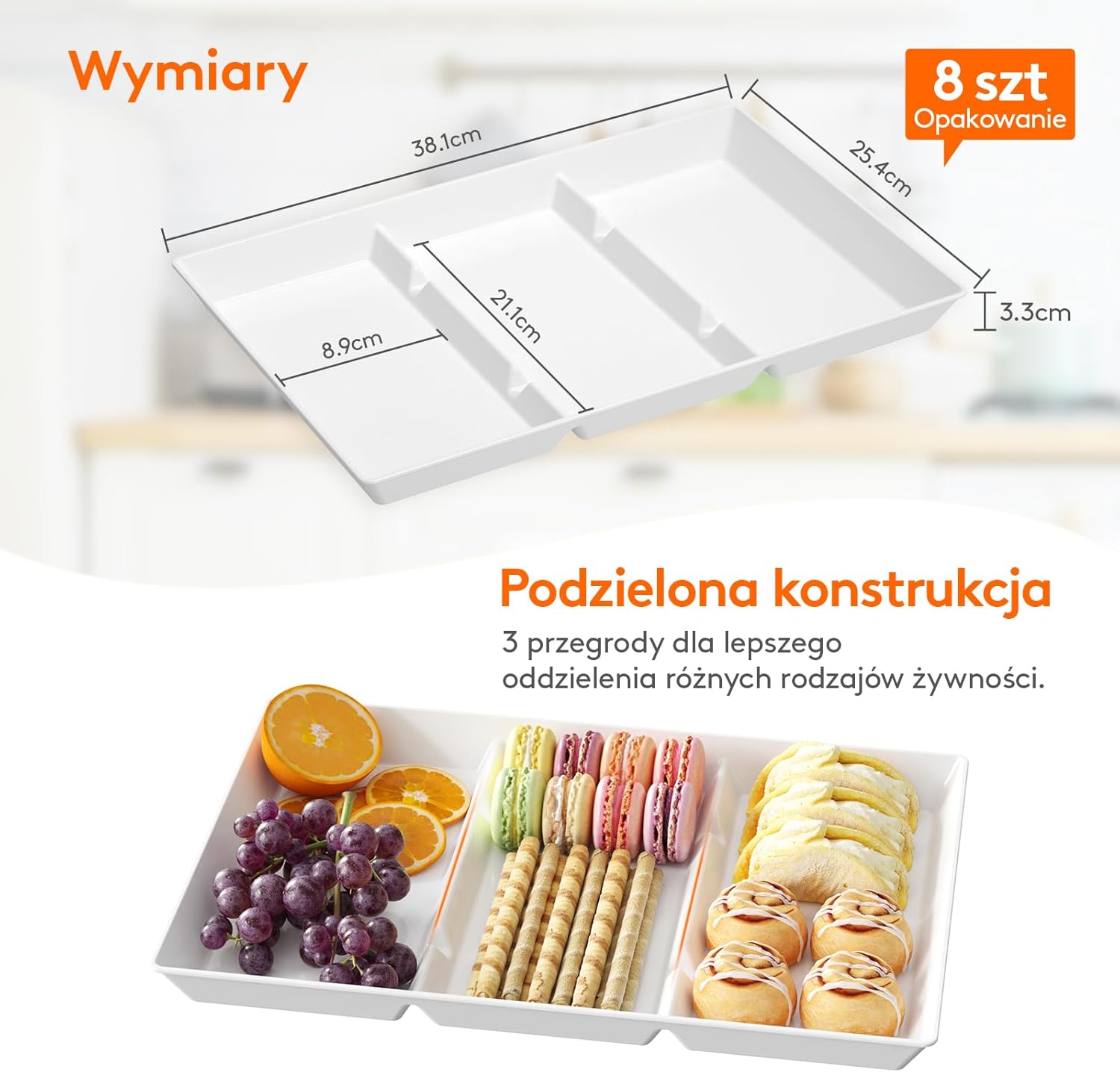 ✅Podzielona konstrukcja: Zestaw zawiera 8 tace, każda o wymiarach 38,1 x 25,4 x 3,3 cm, z 3 przegrodami, które są idealne do serwowania różnych przystawek, deserów, ciastek, owoców, warzyw i nie tylko.