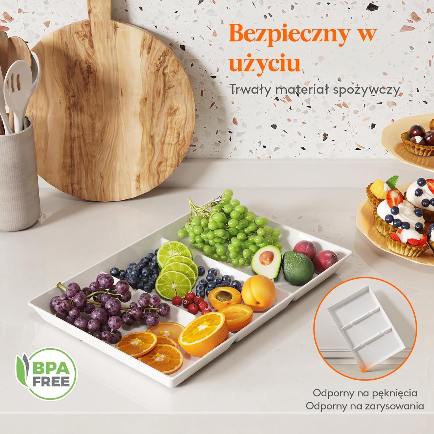 ✅Wytrzymała i odporna na pęknięcia: Taca do serwowania wykonana jest z wysokiej jakości materiału spożywczego, który charakteryzuje się trwałością, odpornością na stłuczenia i pęknięcia. Dodatkowo jest całkowicie wolna od BPA, zapewniając bezpieczeństwo żywności. Ta wielofunkcyjna taca może przechowywać różne produkty spożywcze.