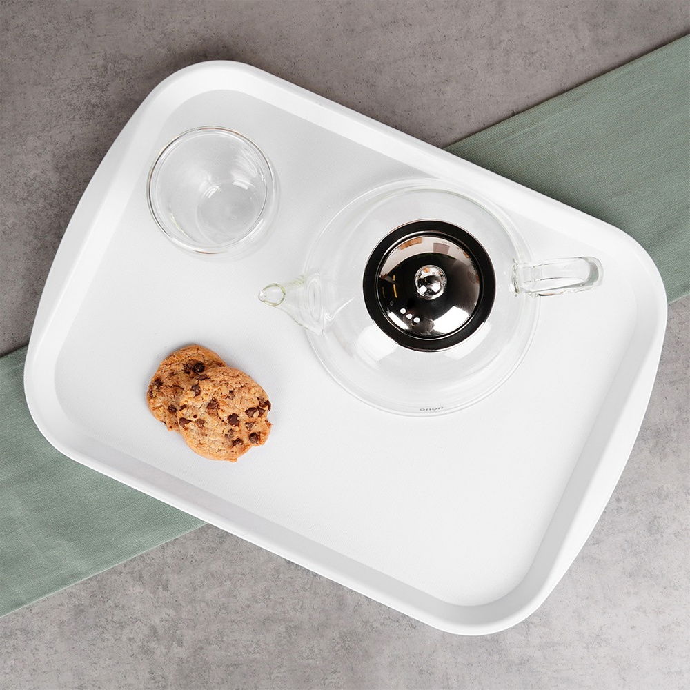 Antypoślizgowa powierzchnia - Antypoślizgowa powierzchnia tacy zapewnia stabilność i bezpieczeństwo podczas przenoszenia napojów i potraw. Dzięki specjalnej strukturze zapobiega przesuwaniu się naczyń, co minimalizuje ryzyko rozlania czy upadku przedmiotów.