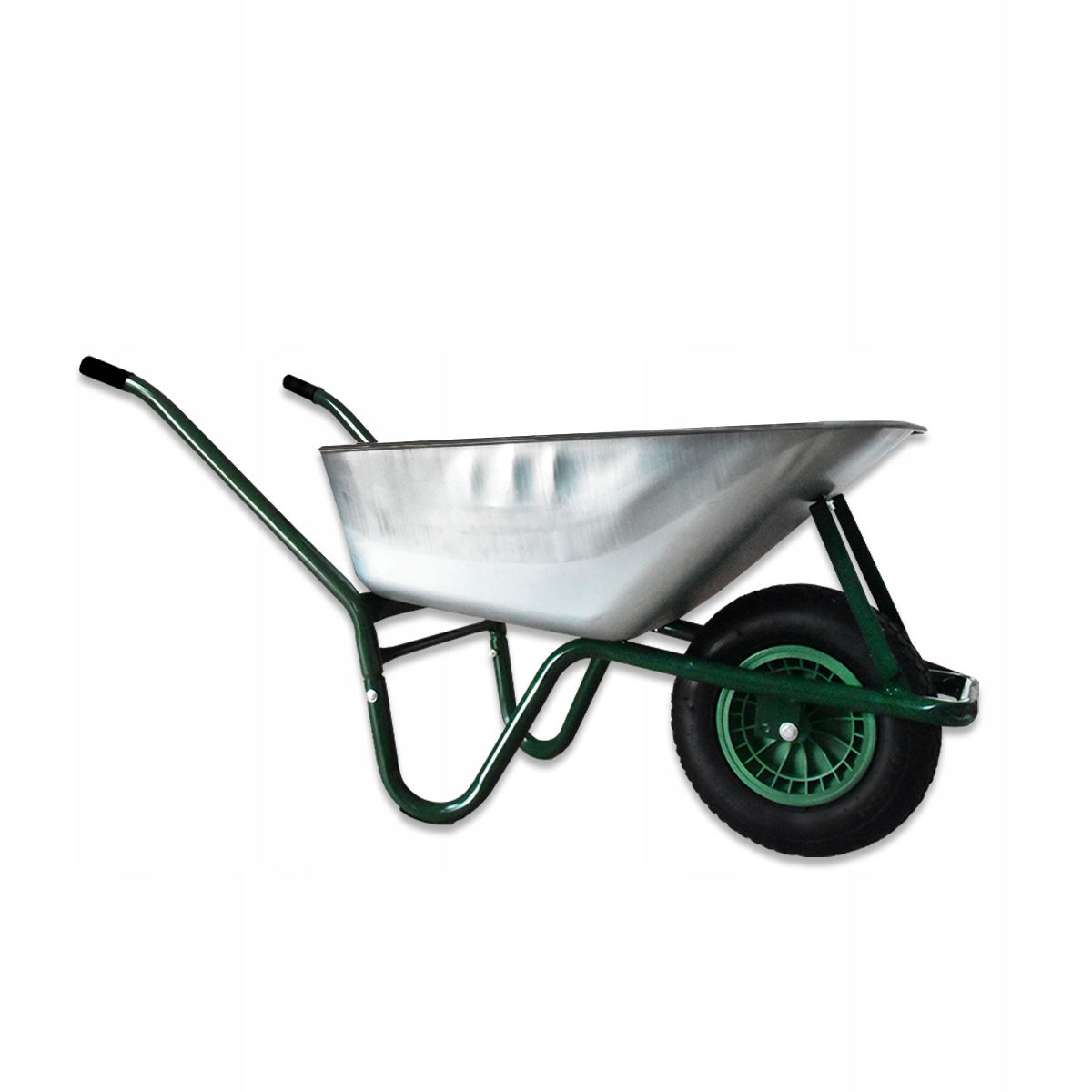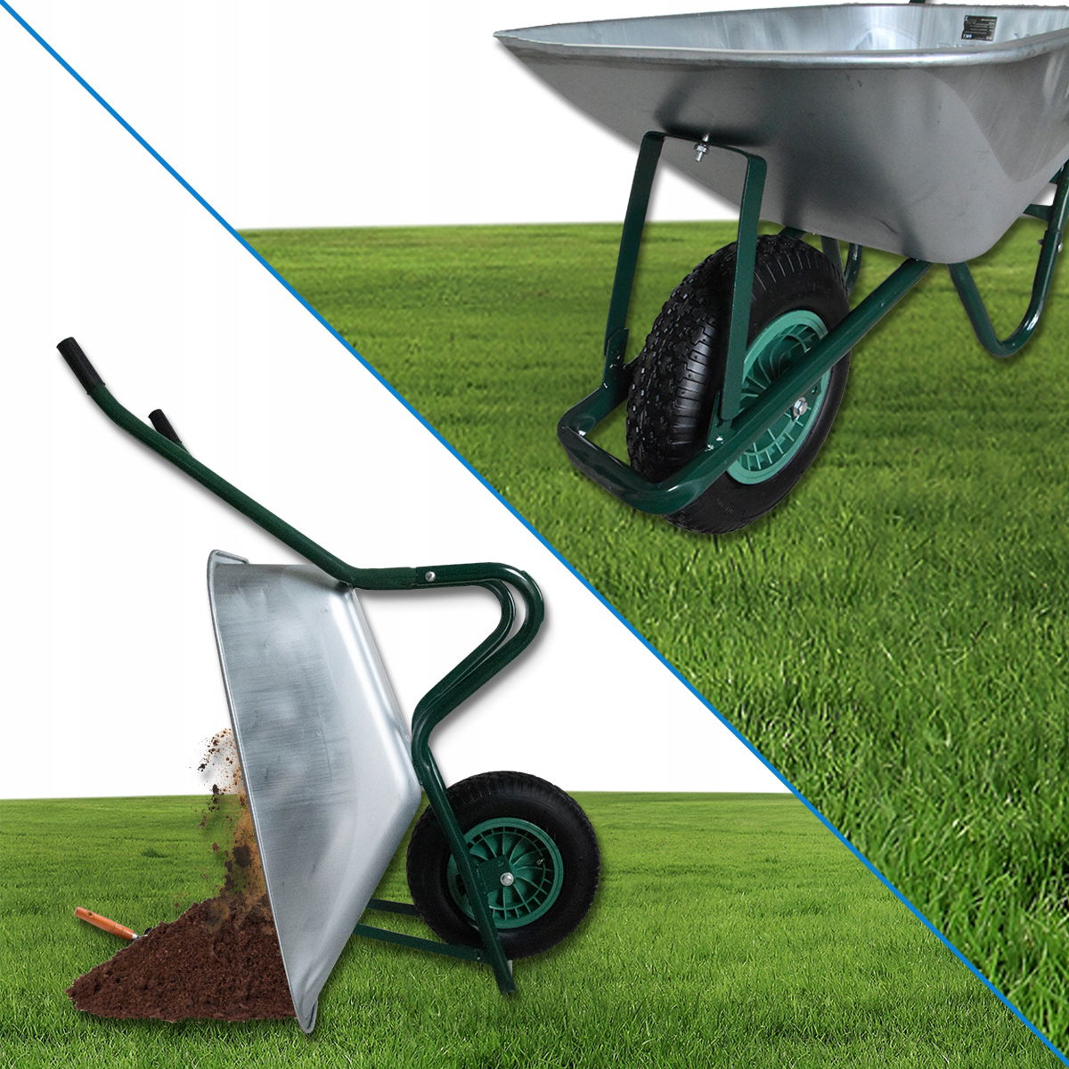 ✅ Taczka została wykonana z ocynkowanej stali (misa) oraz lakierowanego stelażu, co zapewnia odporność na korozję i długą trwałość.