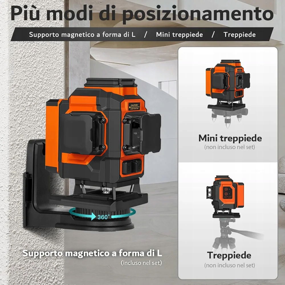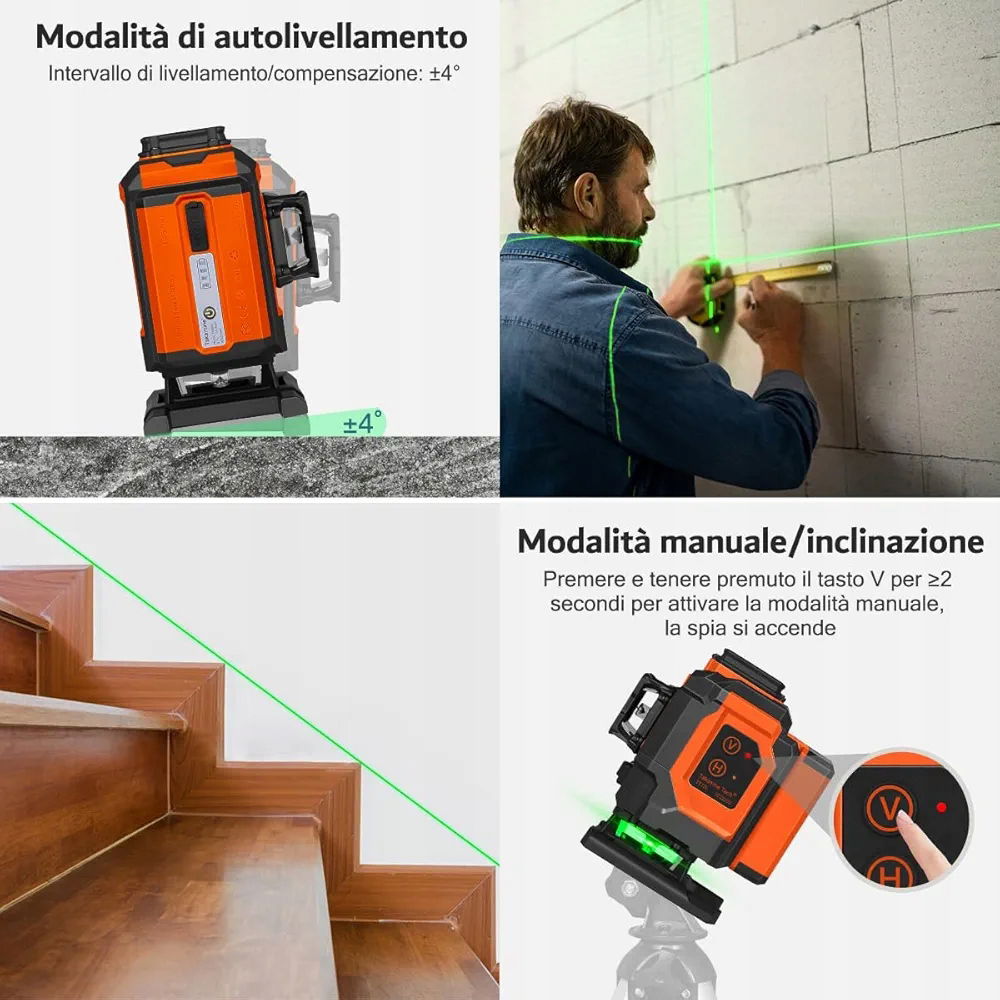 Poziom lasera o wymiarach 3 x 360 x zielony poziom samopoziomujący: Poziom lasera ma płaszczyznę poziomą 360 stopni (dolne okno laserowe może emitować poziomą linię 12,7 mm nad ziemią), dwie pionowe płaszczyzny 360 stopni i 12 linii laserowych pokrywających podłogę, ściany i sufit wokół pomieszczenia. Poziome i pionowe linie przecinają się pod kątem 90 stopni, aby pomóc w szybkiej wizualizacji i ukończeniu kwadratowego układu.