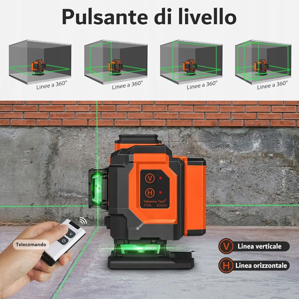 TakamineTech Poziom lasera Samopoziomowanie 360 x 3, 3D Zielony Laser Poziom 12 Linie, Nadaje się do budowy i płytek podłogowych, 5200 mAh Bateria litowa, zdalne sterowanie i magnetyczny stojak obrotowy