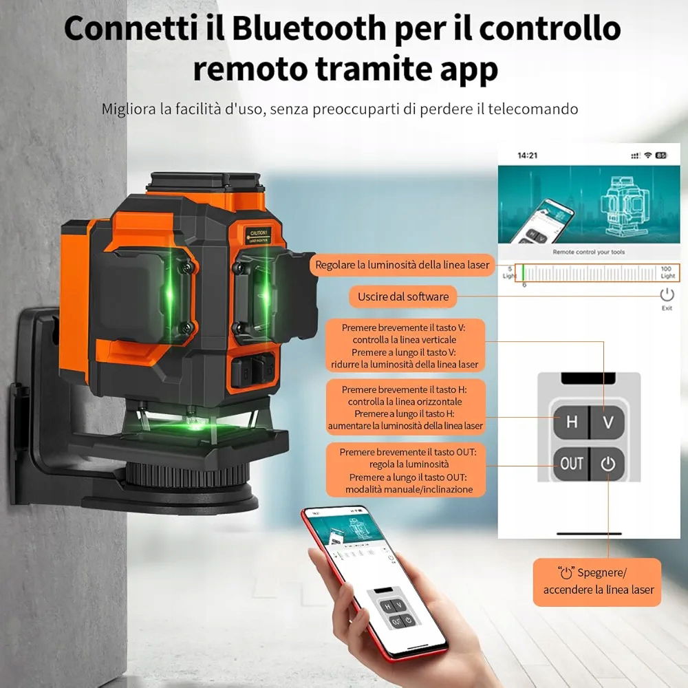 Aplikacja zdalnego sterowania: Po pobraniu aplikacji TakamineTech i aktywacji funkcji Bluetooth możesz zdalnie kontrolować poziom lasera TakamineTech. Za pomocą aplikacji możesz przełączać się między liniami pionowymi i poziomymi, dostosowywać jasność linii laserowych i innych operacji, nie martwiąc się o utratę pilota, dzięki czemu Twoja praca jest jeszcze wygodniejsza
