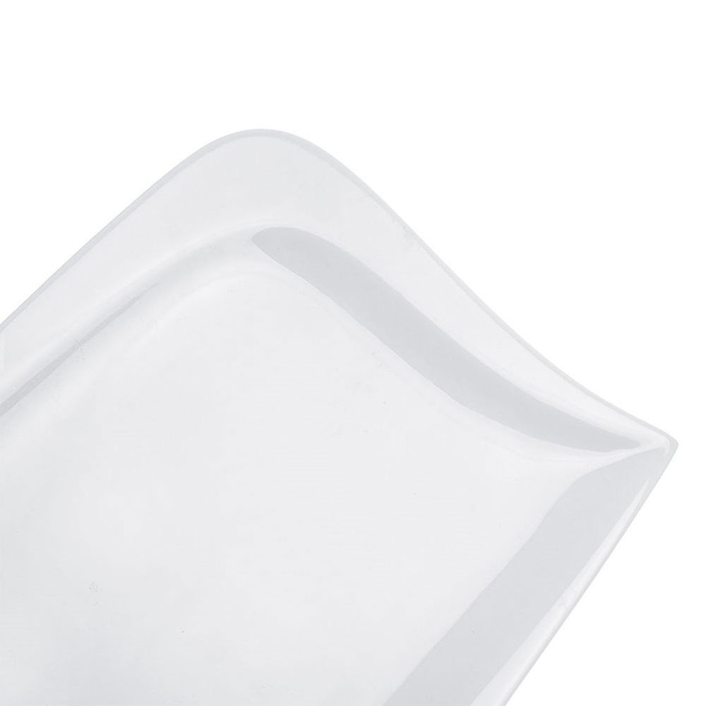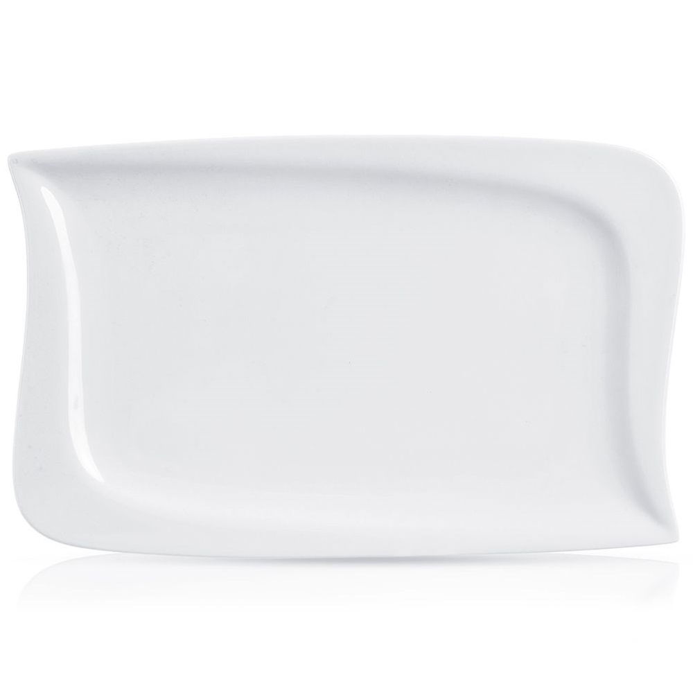 NOWOCZESNY DESIGN - Utrzymany w modnej, białej kolorystyce. Talerz ma elegancki wygląd nieregularnego prostokąta z delikatnie zaokrąglonymi brzegami. Pięknie prezentuje się na stole wraz z inną zastawą.