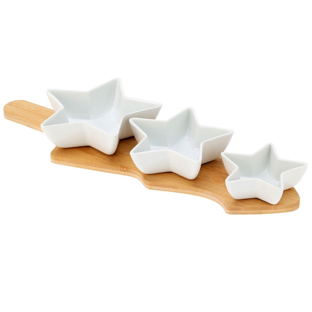 Zestaw do serwowania przekąsek z tacą - 4-elementowy zestaw do serwowania, składający się z trzech miseczek w kształcie gwiazdki oraz tacy w kształcie choinki. Idealne do eleganckiego podawania orzeszków, oliwek, dipów i innych drobnych przekąsek podczas świątecznych spotkań. Taca wraz z miseczkami ma wymiary 42 x 14 x 5,5 cm. W zestawie: gwiazdka mała o wymiarach 10 x 3 cm i pojemność 65 ml, gwiazdka średnia 12,5 x 4 cm i pojemności 140 ml oraz gwiazdka duża o wymiarach 13 x 5 cm i pojemności 150 ml.