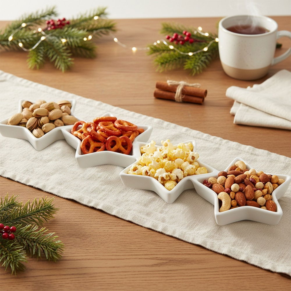 Unikalny design z czterema gwiazdami - Półmisek wyróżnia się oryginalnym kształtem z czterema gwiazdami, połączonymi w jedną całość. Pozwala to na serwowanie czterech różnych rodzajów przekąsek na jednym naczyniu w bardzo efektowny sposób.