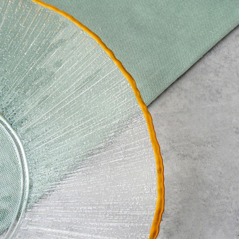 Efektowny design - Ten szklany talerz wyróżnia się eleganckim, złotym wykończeniem i subtelną teksturą, która nadaje mu luksusowy charakter. Nowoczesny design sprawia, że jest wyjątkowym elementem każdej zastawy stołowej.