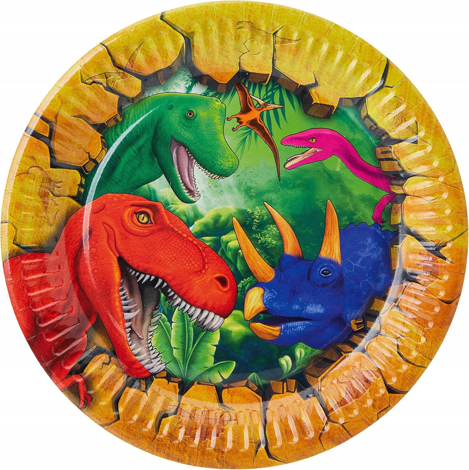 Wyjątkowy motyw: Talerzyki ozdobione grafiką dinozaurów, idealne na przyjęcia urodzinowe dzieci, szczególnie dla miłośników prehistorycznych stworzeń.