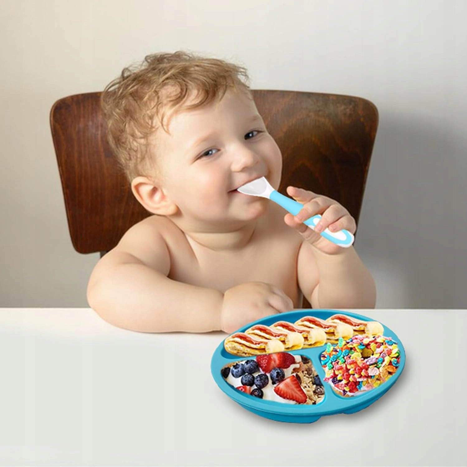 Zestaw talerz i sztućce dla niemowląt z przyssawką, silikonowy talerz dziecięcy z łyżką, widelcem, bez BPA, antypoślizgowy, dla małych dzieci z przegródkami, zestaw naczyń dla dzieci, silikonowy.
