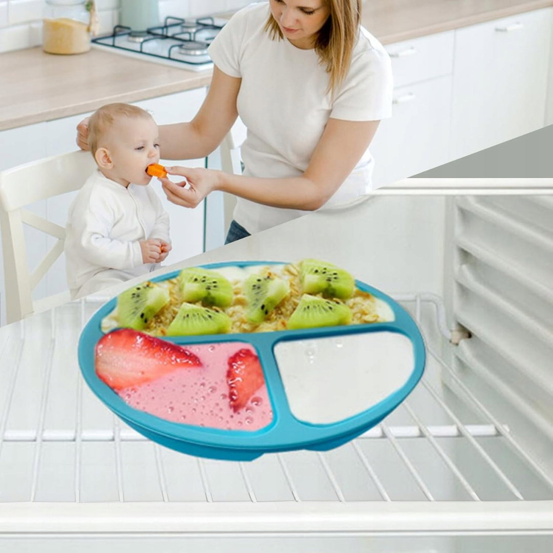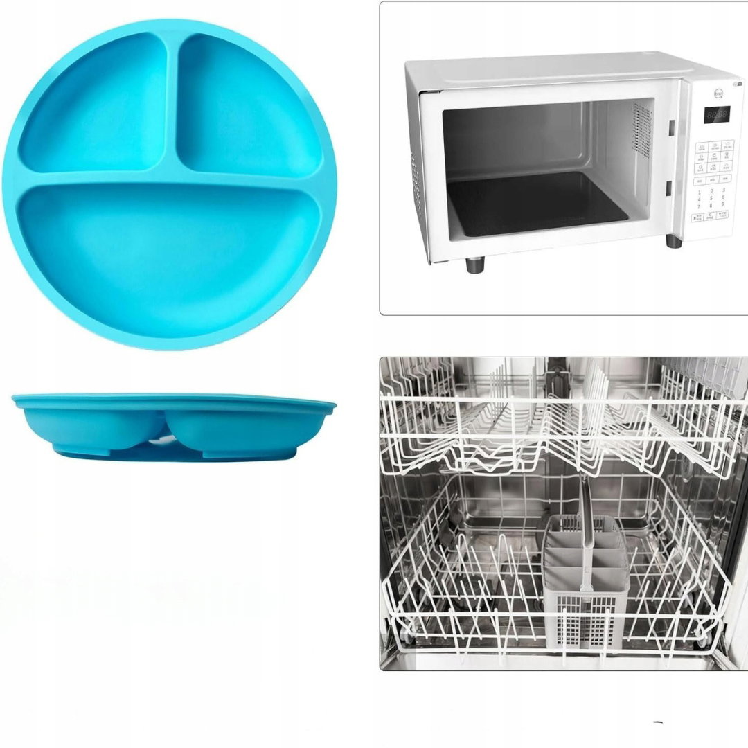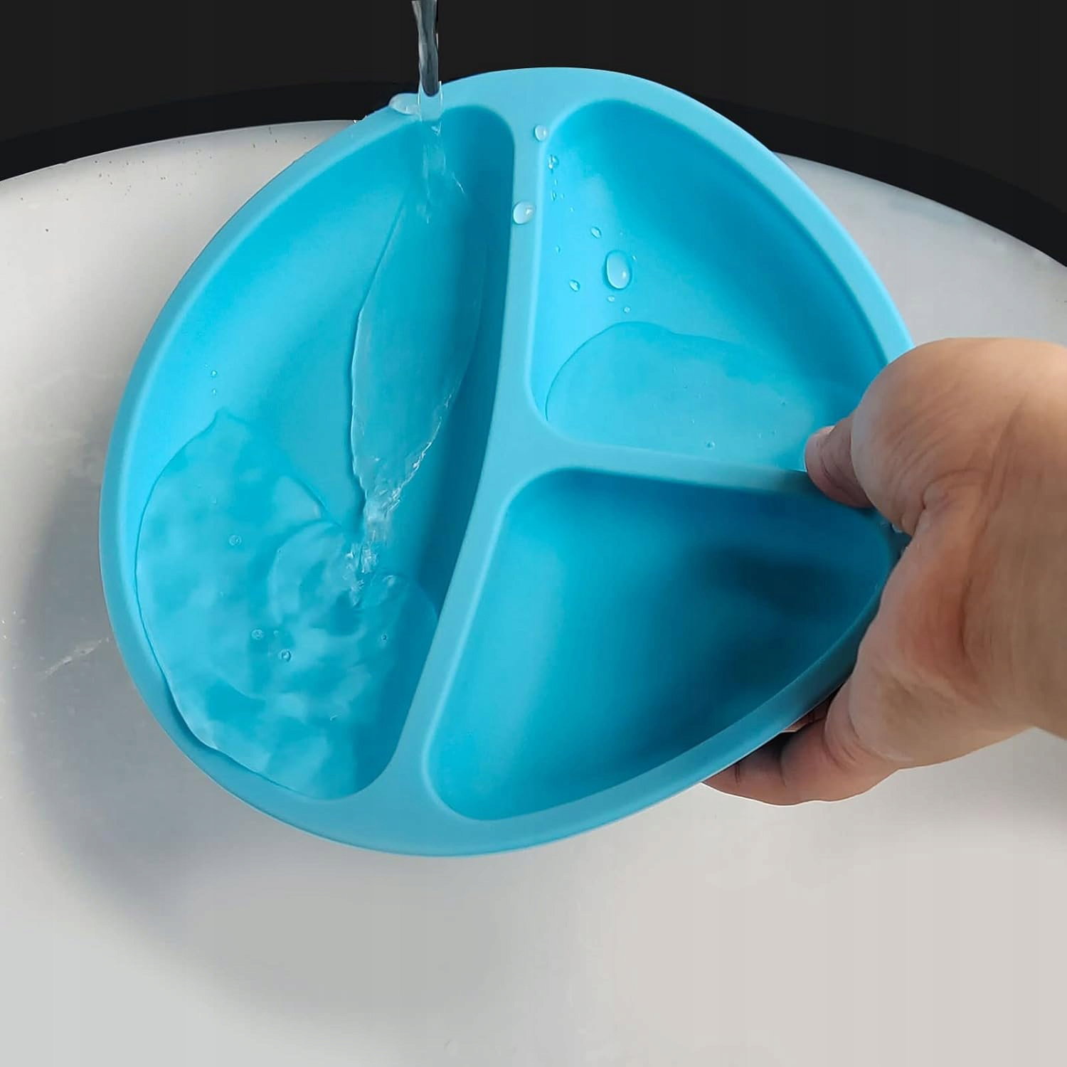 - Zastosowanie: talerz silikonowy z przyssawką służy do podawania jedzenia dzieciom w bezpieczny i wygodny sposób. Dzięki trzem przegródkom pozwala na oddzielne serwowanie różnych rodzajów jedzenia, takich jak owoce, warzywa czy sosy, zapobiegając ich mieszaniu. Przyssawka zapewnia stabilność talerza, zapobiegając przewróceniu, co jest szczególnie przydatne podczas nauki samodzielnego jedzenia. Jest łatwy w czyszczeniu i bezpieczny w użyciu w kuchence mikrofalowej oraz zmywarce.