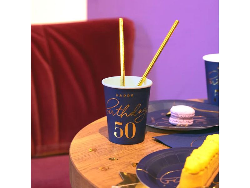 Talerzyki papierowe w kolorze granatowym z złotym napisem z motywem urodzinowym: Happy Birthday 50. W opakowaniu znajduje się 6 sztuk talerzyków o średnicy 18 cm. Idealnie nadają się na przyjęcia w domowym zaciszu, aby dodać akcent elegancji. Dzięki tak pięknym talerzykom możesz uszczęśliwić przyjaciela i sprawić mu niesamowitą niespodziankę.