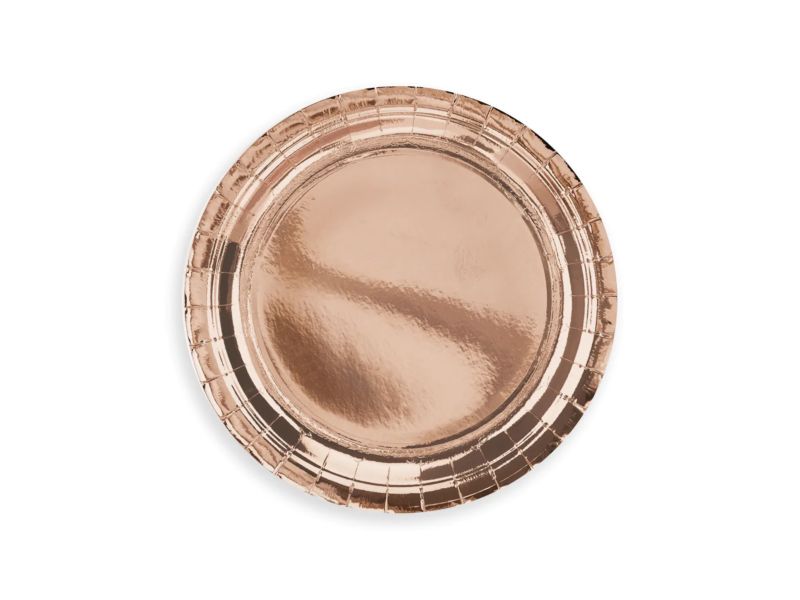 Talerzyki papierowe w kolorze różowo złotym, okrągłe. W opakowaniu znajduje się 6 sztuk talerzyków o średnicy 23 cm. Idealnie nadają się na przyjęcia w domowym zaciszu, aby dodać akcent elegancji. Dzięki tak pięknym talerzykom możesz uszczęśliwić przyjaciela i sprawić mu niesamowitą niespodziankę.