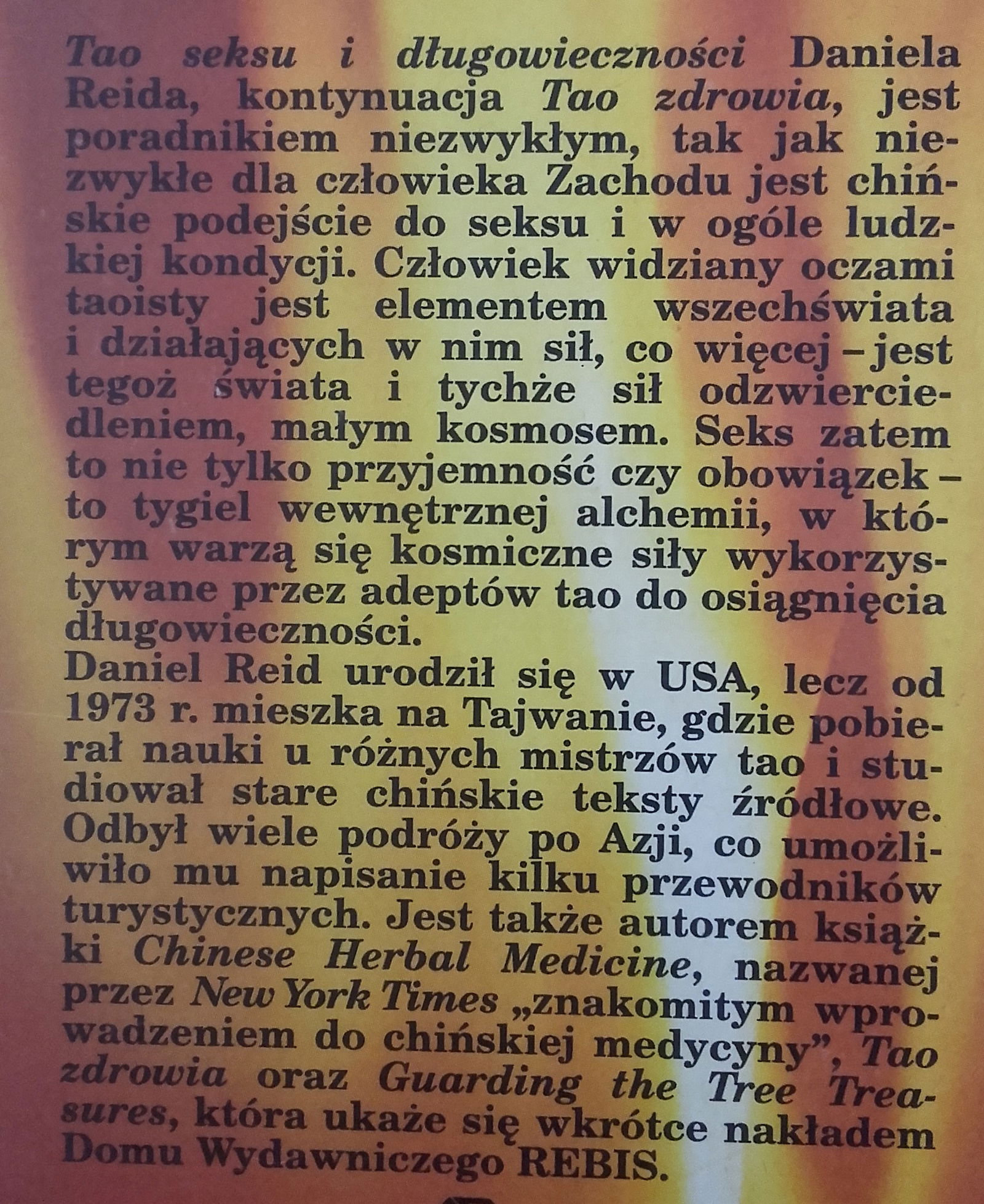 Tao seksu i długowieczności Daniela Reida, kontynuacja Tao zdrowia, jest poradnikiem niezwykłym, tak jak niezwykłe dla człowieka Zachodu jest chińskie podejście do seksu i w ogóle ludzkiej kondycji. Człowiek widziany oczami taoisty jest elementem wszechświata i działających w nim sił, co więcej - jest tegoż świata i tychże sił odzwierciedleniem, małym kosmosem. Seks zatem to nie tylko przyjemność czy obowiązek - to tygiel wewnętrznej alchemii, w którym warzą się kosmiczne siły wykorzystywane przez adeptów tao do osiągnięcia długowieczności.Daniel Reid urodził się w 1948 r. w San Francisco, dzieciństwo spędził w Afryce. W Berkeley studiował kulturę Dalekiego Wschodu, a przez 16 lat pobierał na Tajwanie nauki u mistrzów tao. W 1999 r. osiadł z żoną w Australii, często bywa w Chinach. Napisał ponad trzydzieści książek o medycynie taoistycznej i przewodników po Azji Wschodniej. Autor wydanych przez REBIS poradników Tao zdrowia i Na straży Trzech Skarbów.