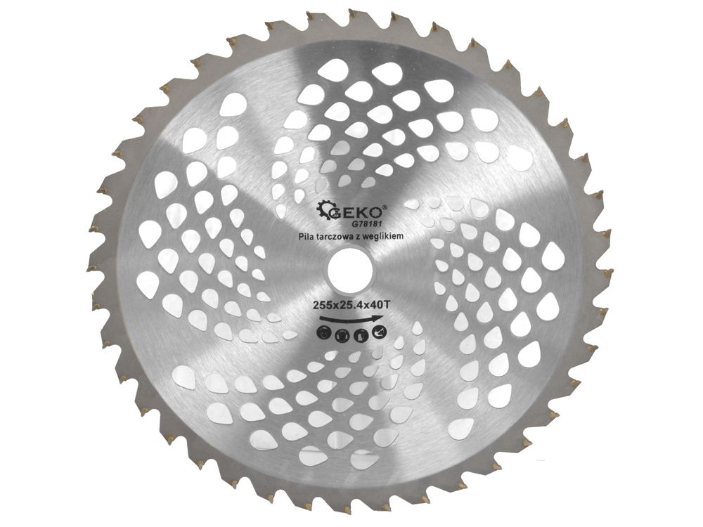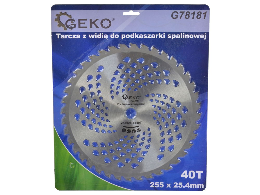 Specjalna tarcza tnąca z widią marki Geko, o wymiarach 255x25.4 mm z 40 zębami tnącymi - do zastosowania z kosami oraz podkaszarkami spalinowymi.