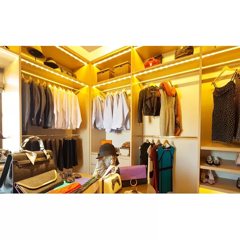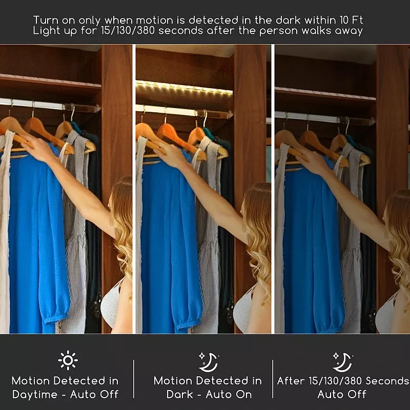 Taśma LED z czujnikiem ruchu i zmierzchu przeznaczona do podświetlenia łub łóżka idealne rozwiązanie oświetlenia wnętrza szafy z pewnością ułatwi znalezienie w szafie ubrania czy dodatku, którego właśnie szukasz. Zapali się automatycznie po jej otwarciu oraz zgaśnie tuż po jej zamknięciu. Sprawdzi się również do jako podświetlenie szafki kuchennej czy łóżka. Listwa świeci przyjemnym ciepłym światłem i zapewnia wystarczającą ilość światła do orientacji ale jednocześnie nie oślepia. Sterowanie zapewnia sterownika z czujnikiem PIR, można wybrać czas świecenia od 15 sekund. Zasięg czujnika jest ustawiony fabrycznie na odległość do 4 metrów. Taśma LED zasilana jest z zasilacza czterech baterii AAA.
