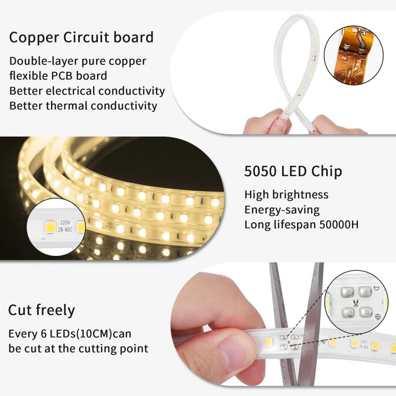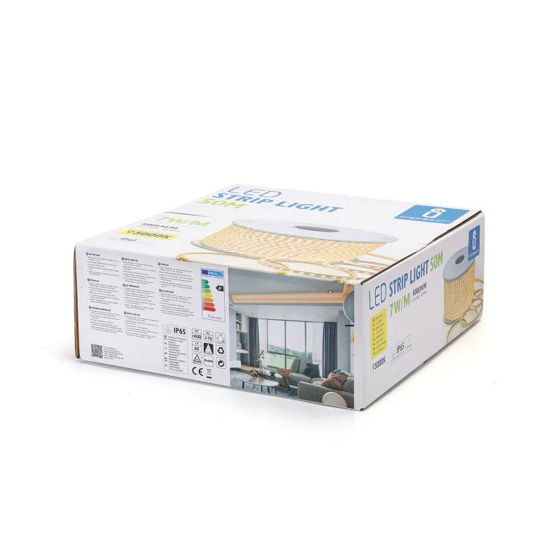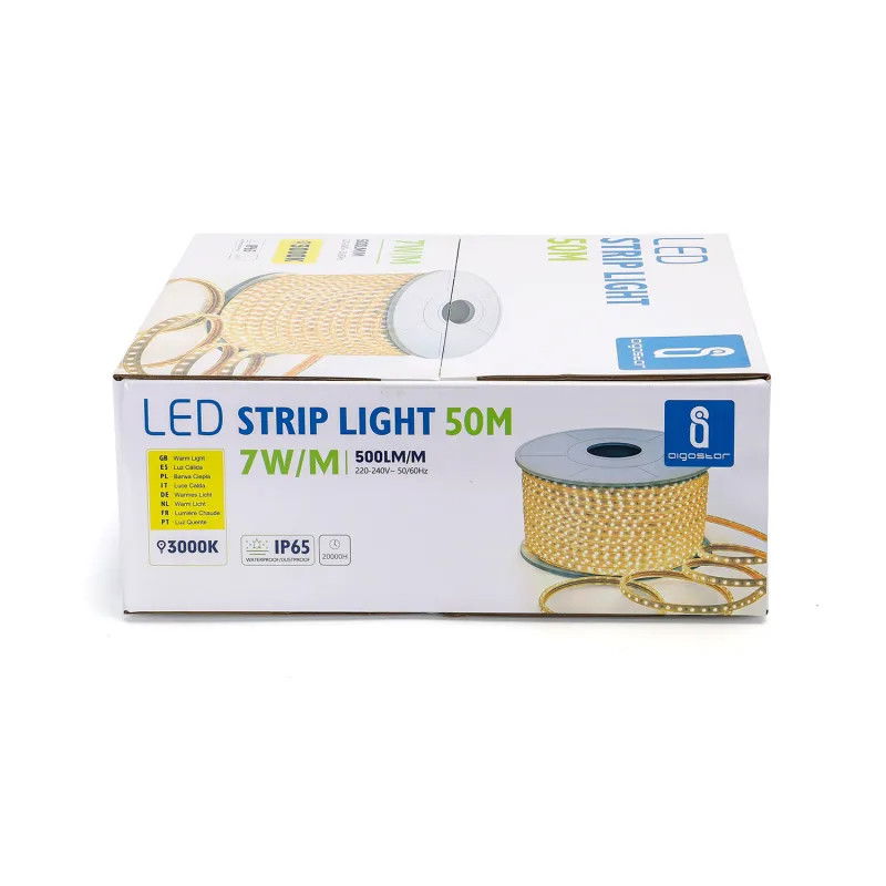 Szpulka 50 metrów gęstej taśmy na 230v barwa biała ciepła, w elastycznej wodoodpornej osłonie, wykonanej w technologii smd na diodach 2835 w ilości 120 diod na metr bieżący z możliwością cięcia i łączenia co jeden metr. Zasilanie wysokim napięciem sieci pozwala wyeliminować spadki napięć na dłuższych odcinkach taśmy świeci jednakowo jasno na całej długości.