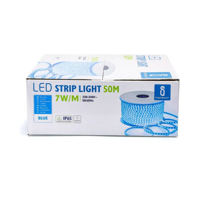 Szpulka 50 metrów taśmy diodowej na 230v o niebieskiej barwie, w elastycznej wodoodpornej osłonie, wykonanej w technologii smd na diodach 5050 w ilości 60 diod na metr bieżący z możliwością cięcia i łączenia co jeden metr. Zasilanie wysokim napięciem sieci pozwala wyeliminować spadki napięć na dłuższych odcinkach taśmy świeci jednakowo jasno na całej długości.