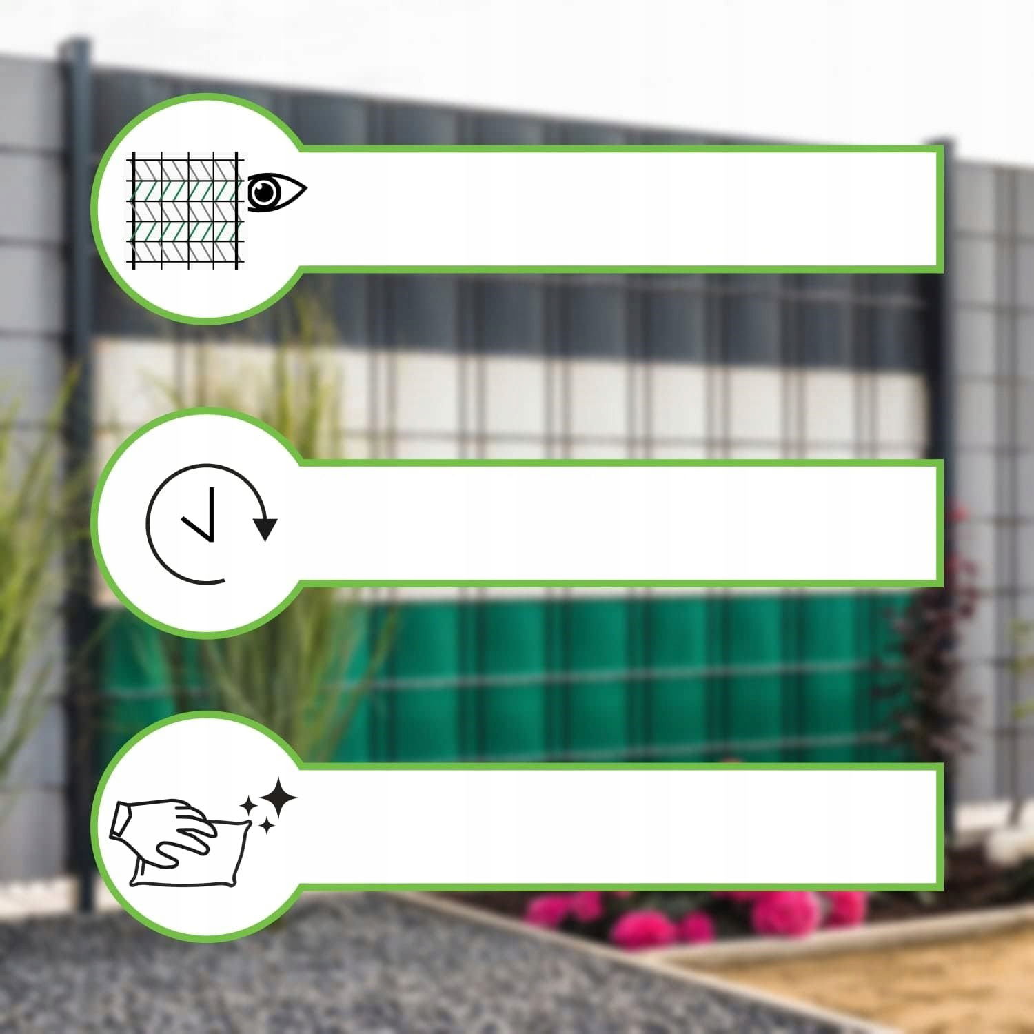 - ✅ Trwałość i ochrona UV – taśma ogrodzeniowa Workinghouse z PCW (tworzywo sztuczne) jest odporna na warunki atmosferyczne , chroni również przed promieniowaniem UV, jest odporna na rozerwania, nie wymaga konserwacji i jest łatwa w montażu. W razie potrzeby ogrodzenie ogrodowe można czyścić wężem. Wskazówka: taśmy maskujące z PCW mają matową i błyszczącą stronę!
