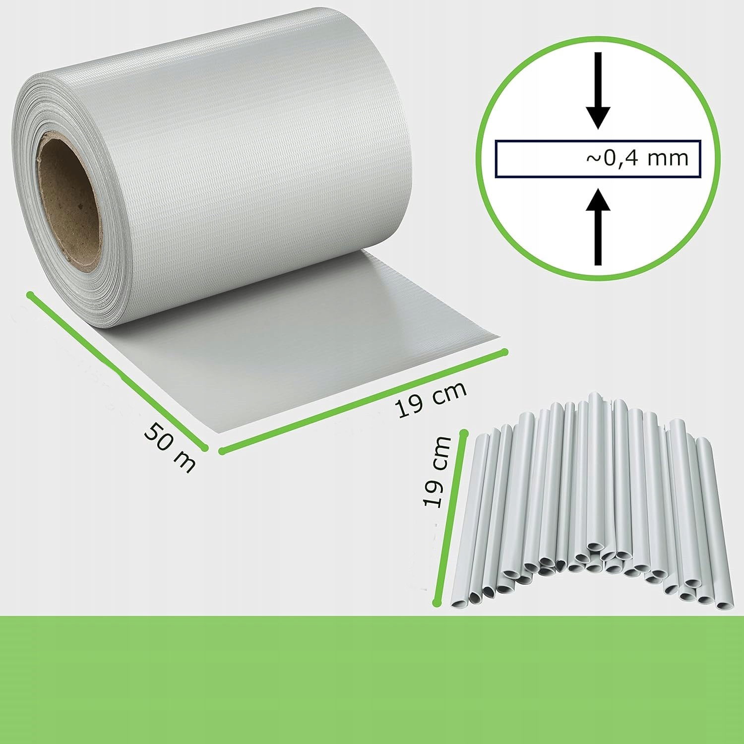 - 1 rolka taśmy ogrodzeniowej 50m x 19cm w kolorze szarym.