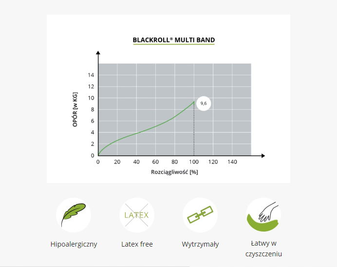 BLACKROLL® MULTI BAND został stworzony z opatentowanego, przyjaznego dla ciała materiału, gwarantującego komfort użytkowania bez nieprzyjemnego uczucia ciągnięcia i podrażniania skóry. BLACKROLL® MULTI BAND jest innowacyjną taśmą stosowaną w nowoczesnym treningu, spełniając oczekiwania zarówno profesjonalistów, jak i sportowców amatorów. Taśma BLACKROLL® MULTI BAND jest silna, elastyczna, wytrzymała i odporna na rozerwanie. W kontakcie ze skórą jest przyjemnie miękka.