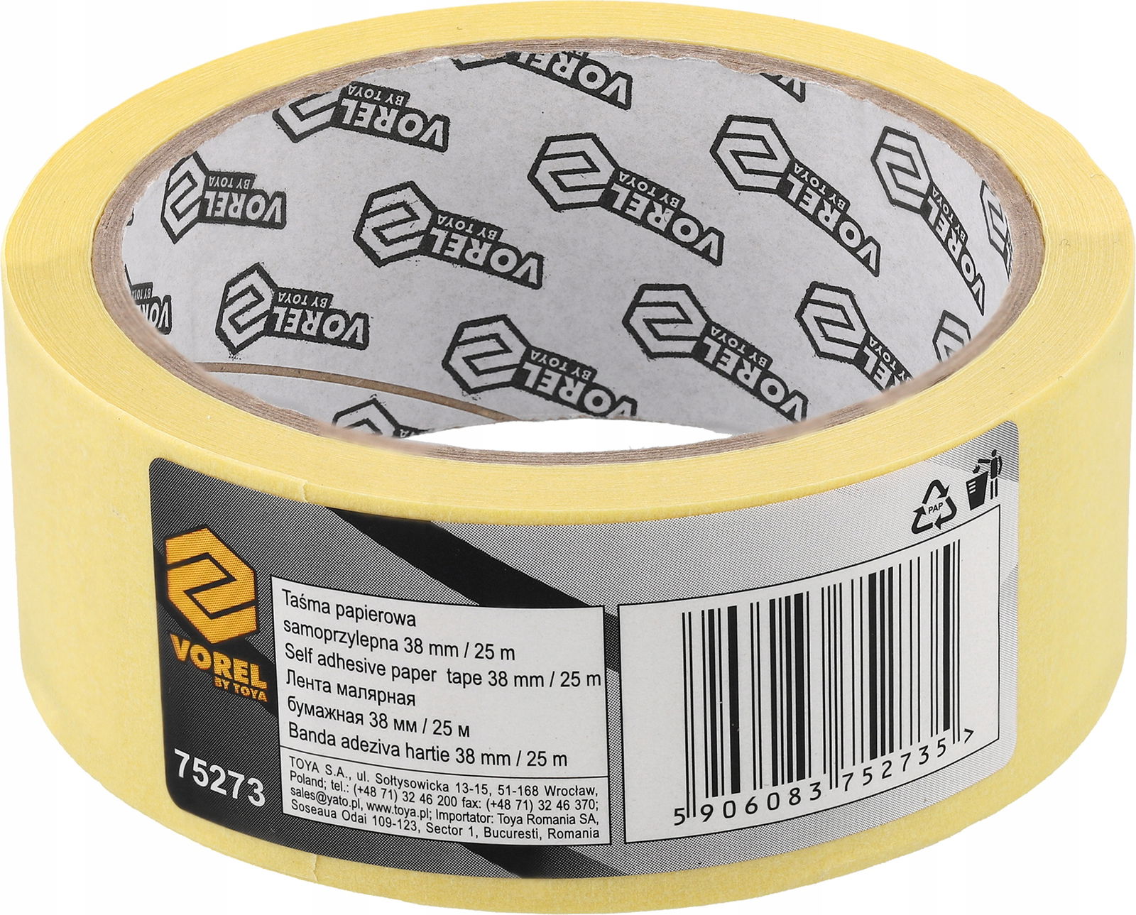 Papierowa taśma malarska samoprzylepna o wymiarach 38 mm/25 m. Służy do zabezpieczenia krawędzi i innych powierzchni narażonych na zabrudzenie podczas prac tynkarsko-malarskich na zewnątrz i wewnątrz budynków.