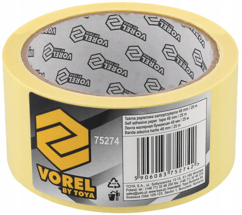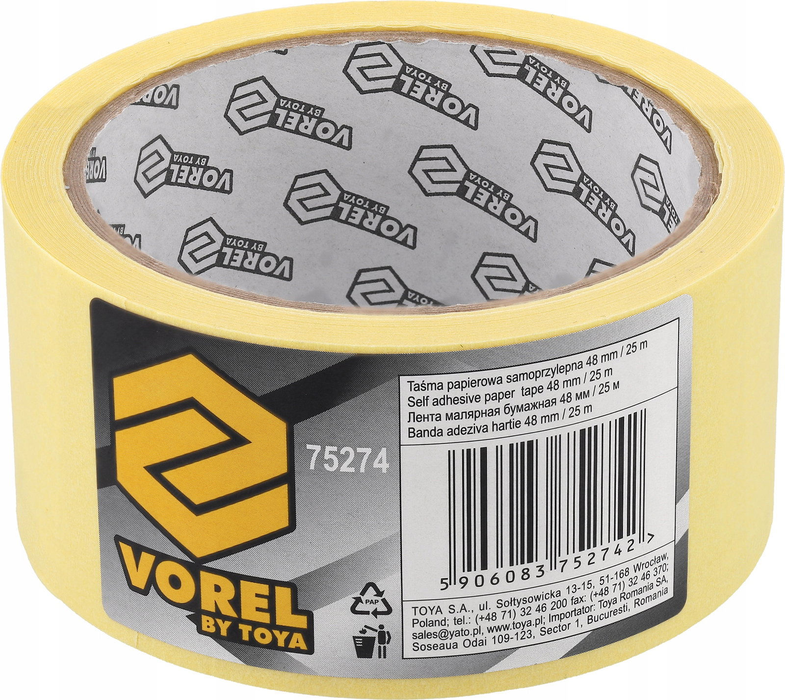 Papierowa taśma malarska samoprzylepna o wymiarach 48 mm/25 m. Służy do zabezpieczenia krawędzi i innych powierzchni narażonych na zabrudzenie podczas prac tynkarsko-malarskich na zewnątrz i wewnątrz budynków.
