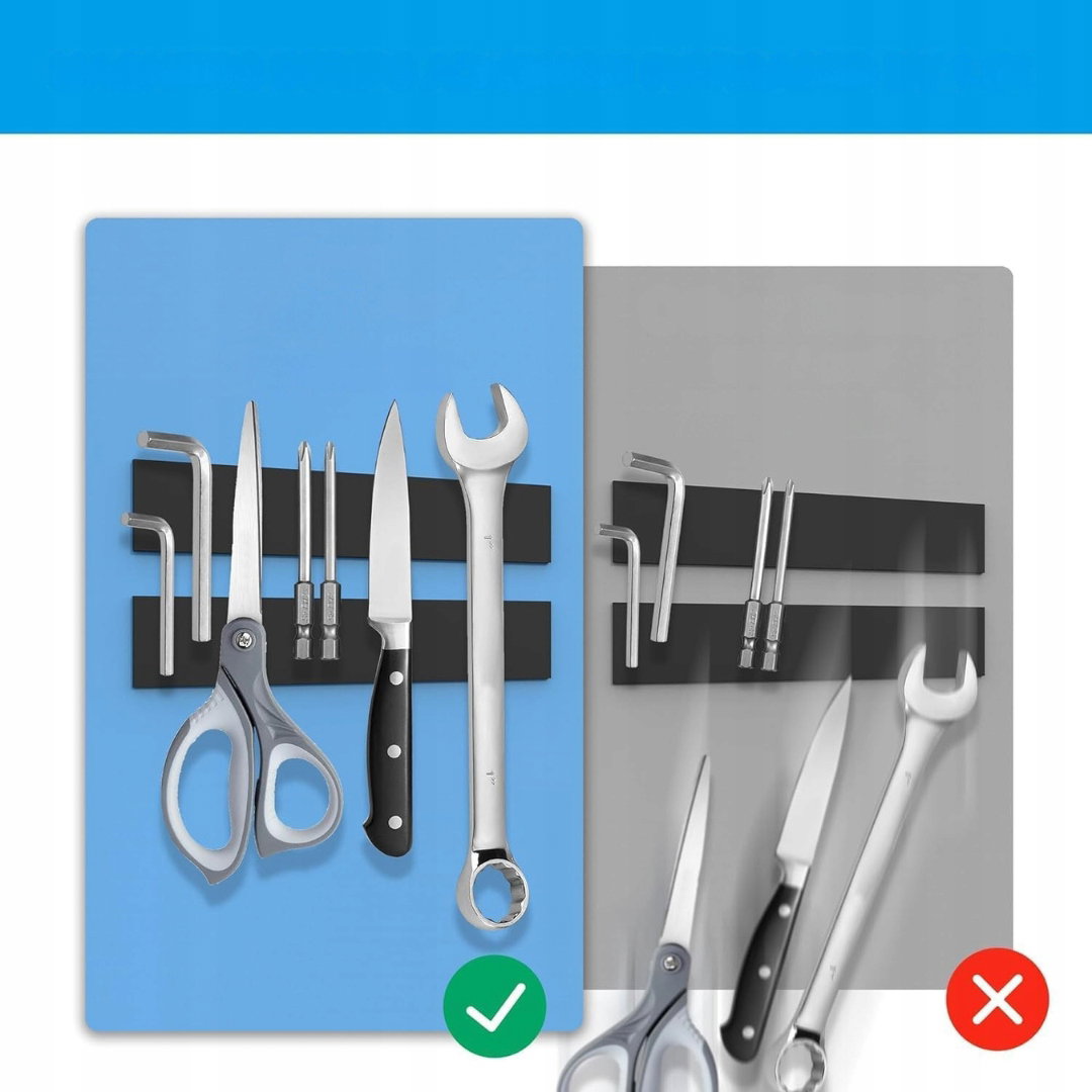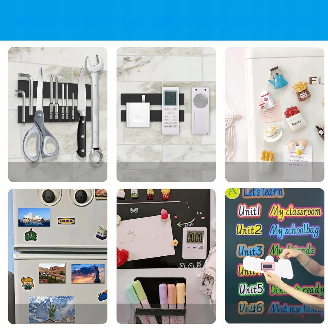 - Wszechstronne zastosowanie: paski magnetyczne mogą pełnić funkcję uchwytu na narzędzia, taśmy na noże, dekoracyjnych naklejek magnetycznych czy listwy ściennej. Sprawdzają się w wielu miejscach — w szkołach, biurach, kuchniach i pracowniach, oferując praktyczny i estetyczny sposób organizacji przestrzeni.