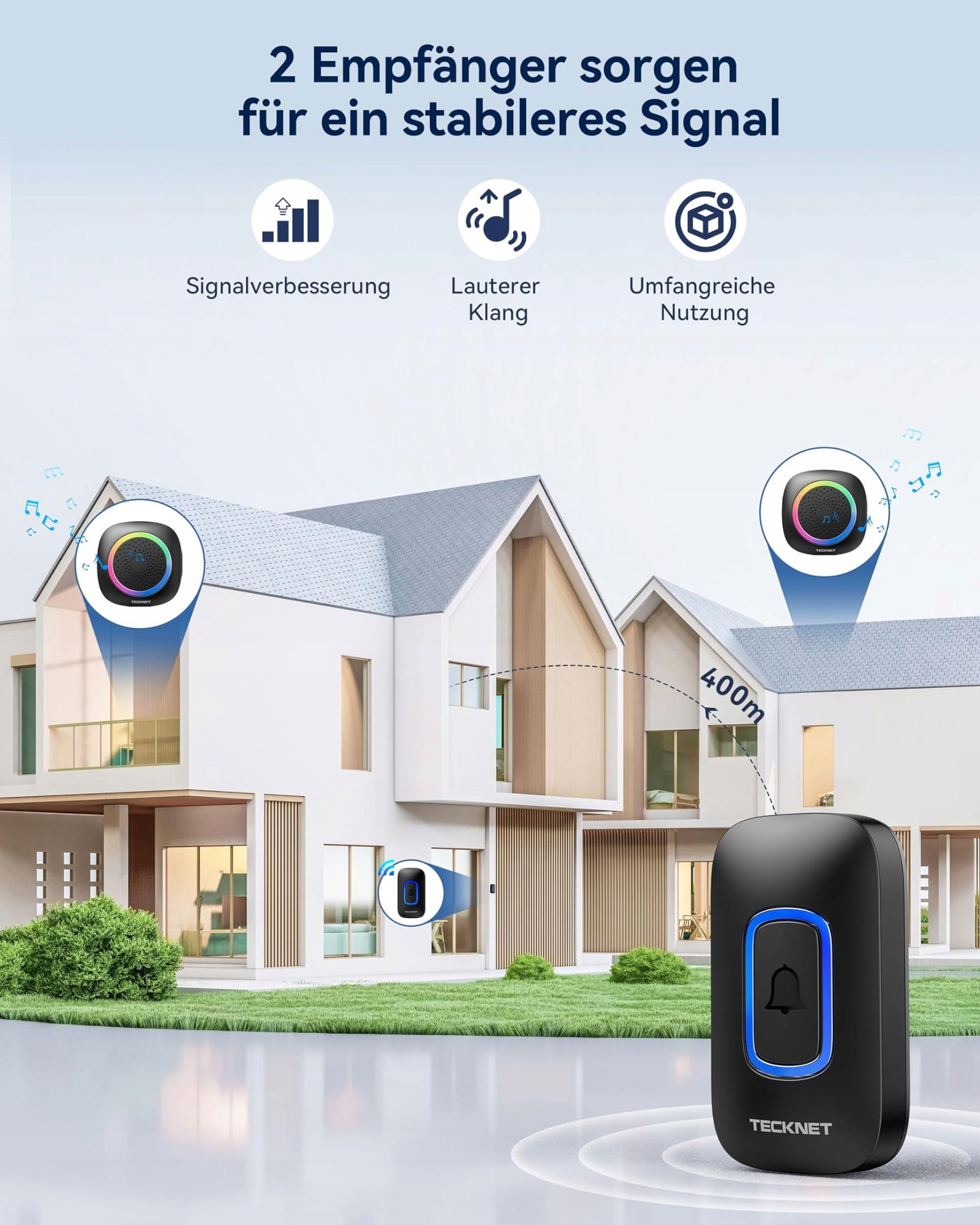 - ?【Zasięg bezprzewodowy 1300 stóp】Bezprzewodowy dzwonek TECKNET może pochwalić się zasięgiem pracy do 1300 stóp w otwartej przestrzeni, nie zakłócając innych pobliskich urządzeń bezprzewodowych. Mocny i stabilny sygnał radiowy zapewnia, że nigdy nie przegapisz gościa.