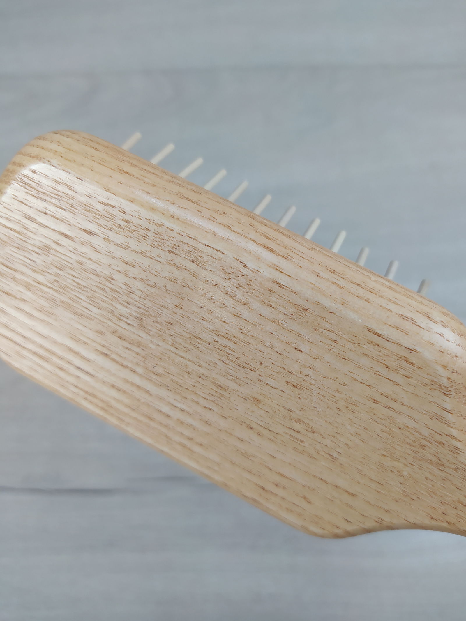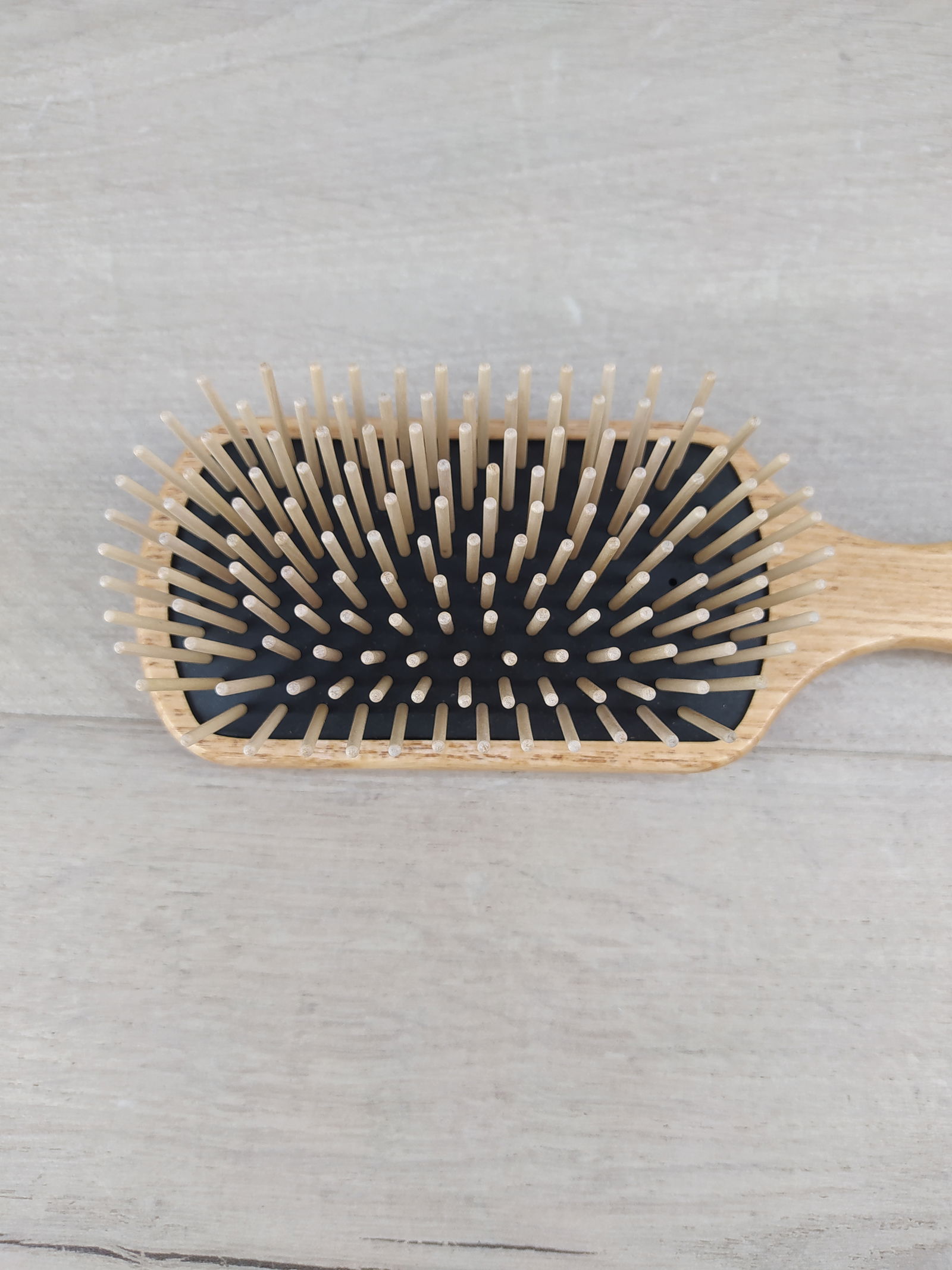 Nasza duża prostokątna szczotka, wykonana w 100% z certyfikowanego drewna jesionowego, rozczesuje włosy, nie niszcząc ich.