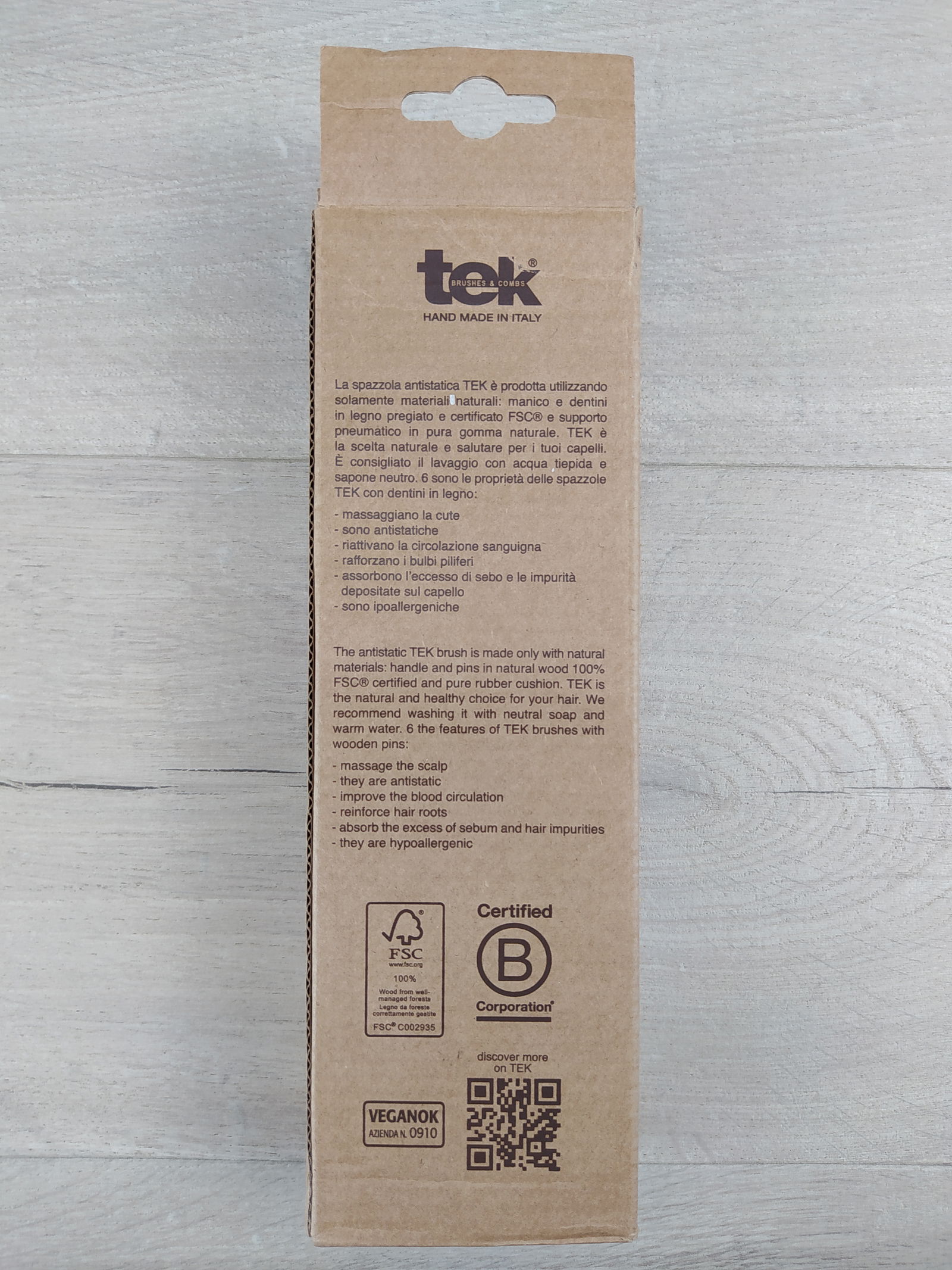 Posiada naturalny kolor drewna, uchwyt jest zabezpieczony woskami i olejami roślinnymi, długi ząb wykonany jest z certyfikowanego drewna grabowego, a czarny element wykonany jest z czystej gumy.