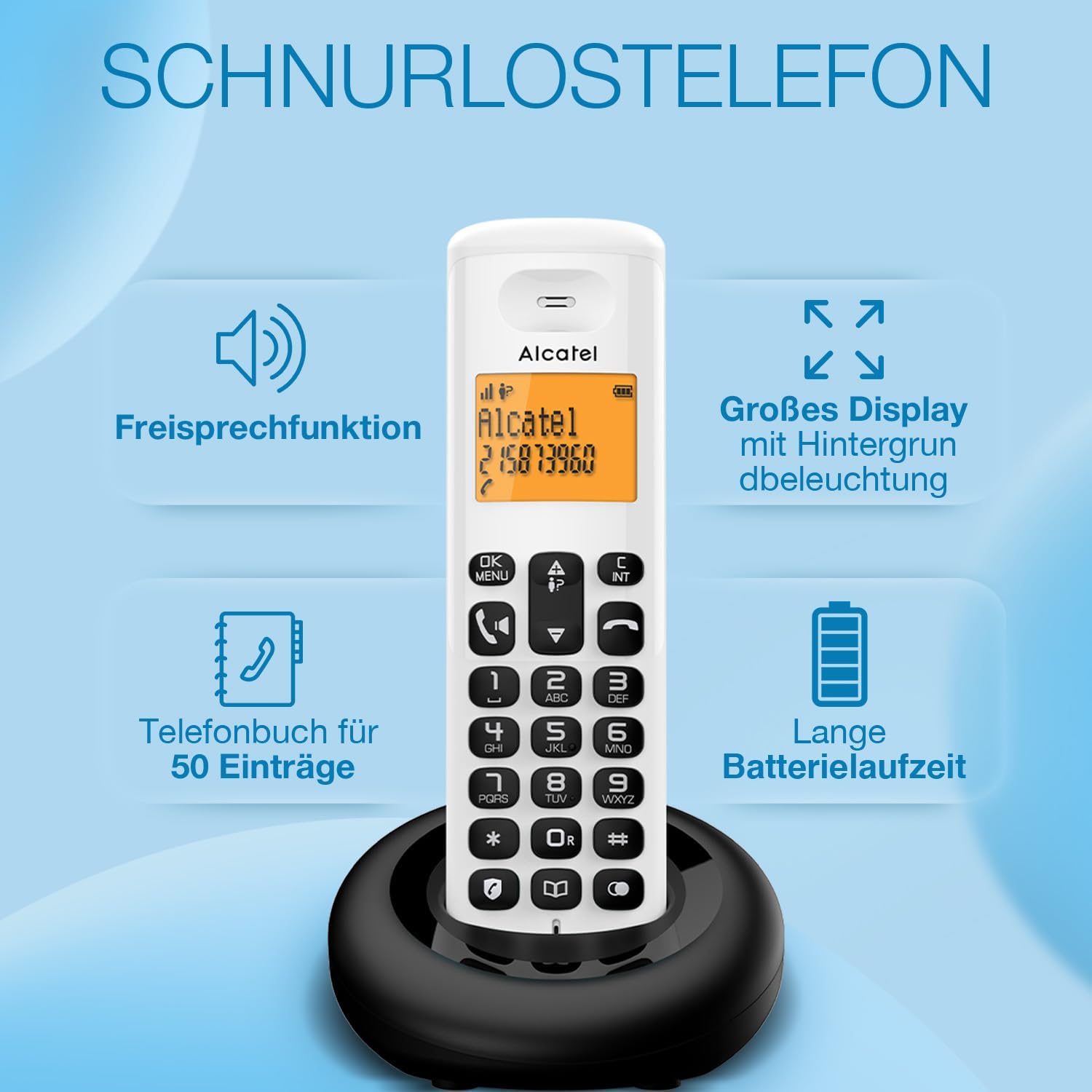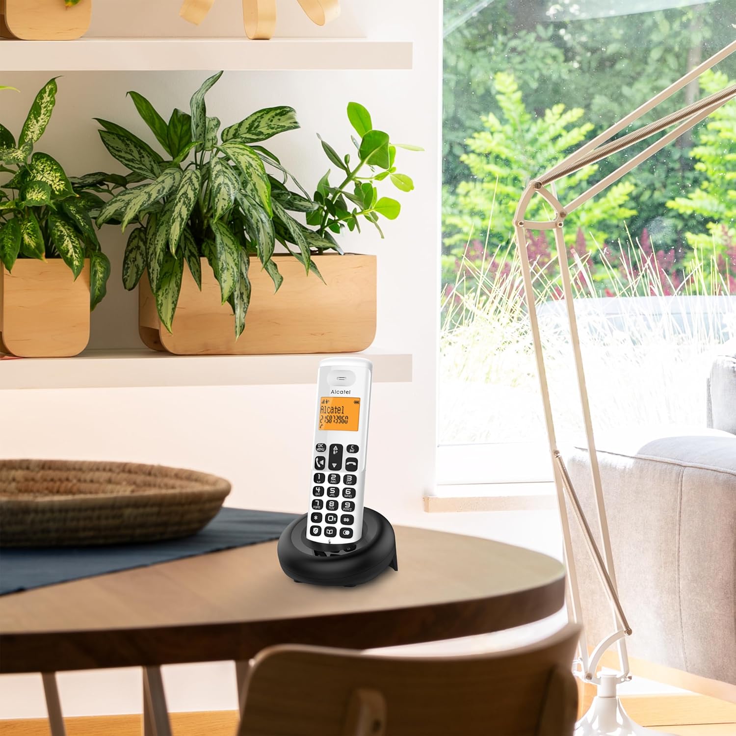 - Duży, praktyczny wyświetlacz: Bezprzewodowy telefon stacjonarny Alcatel E260 o kompaktowej konstrukcji ma duży, podświetlany wyświetlacz 2-wierszowy, który pokazuje nazwę i numer kontaktu na pomarańczowym tle.