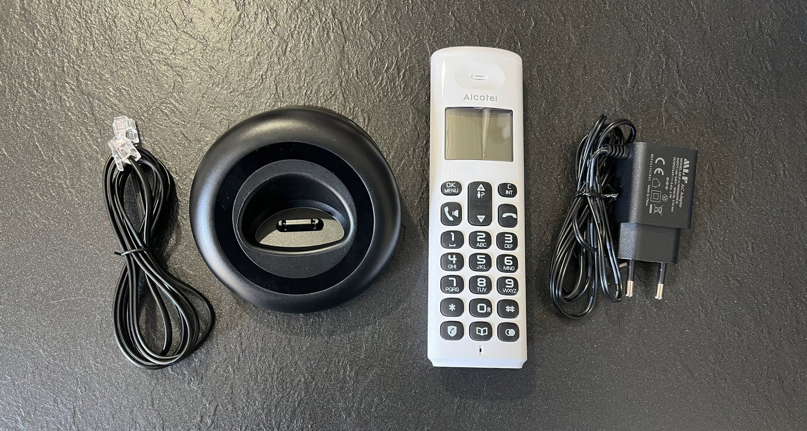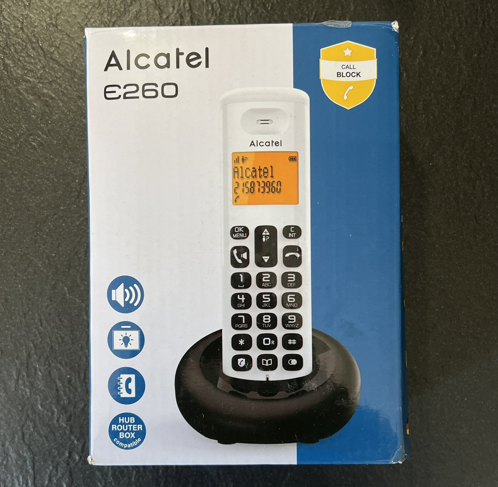 ALCATEL E260 – Telefon bezprzewodowy DECT – Kompaktowa konstrukcja – Duży podświetlany wyświetlacz – Funkcja głośnomówiąca – Biały