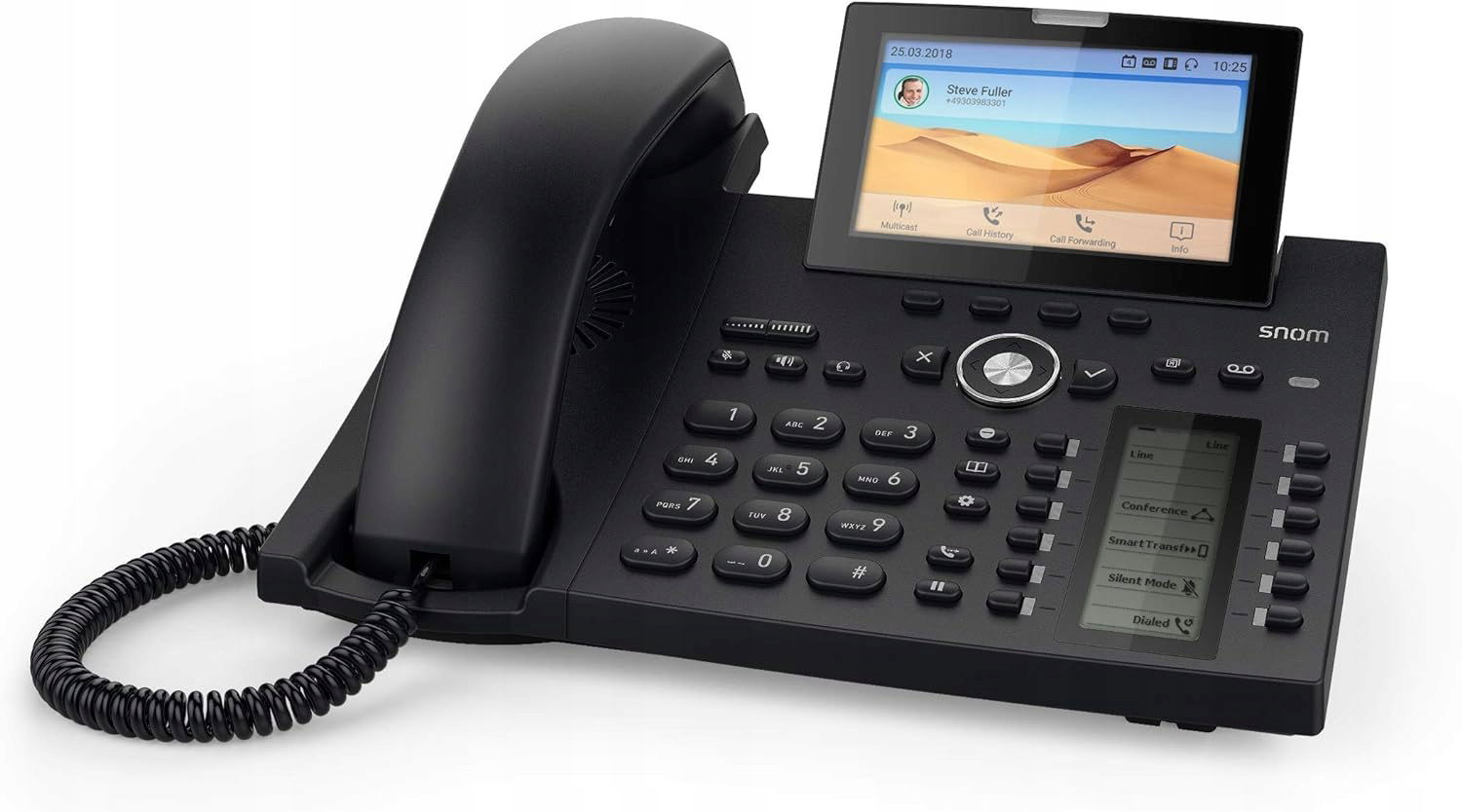 Możliwość podłączenia zestawu słuchawkowego USB; możliwość podłączenia modułu rozszerzenia D3; możliwość podłączenia pamięci USB WiFi; możliwość podłączenia bezprzewodowych zestawów słuchawkowych za pomocą przełącznika elektronicznego (EHS). 2-portowy przełącznik Gigabit Ethernet (RJ45) IEEE 802.3; Power over Ethernet IEEE 802.3af, klasa 3. Zestaw głośnomówiący z szerokopasmowym dźwiękiem; ulepszona jakość dźwięku dzięki procesorowi Digital Signal Processor (DSP). Do 48 przycisków BLF (12 fizycznych); ulepszony interfejs graficzny. Wyświetlacz TFT o wysokiej rozdzielczości 4,3 cala; drugi wyświetlacz z samoopisującymi się przyciskami LED.
