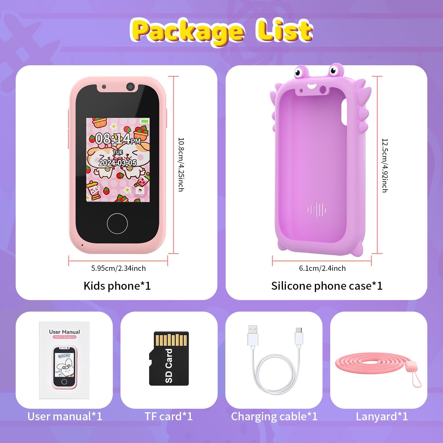 W zestawie karta SD 32G. W zestawie karta micro SD 32G, która może przechowywać tysiące zdjęć, setek filmów lub piosenek. Wyposażony w silikonową obudowę telefonu z uroczym wzorem, jest odporny na upadki i trwały. Aby zapobiec zgubieniu, telefon jest wyposażony w smycz ułatwiającą przenoszenie.