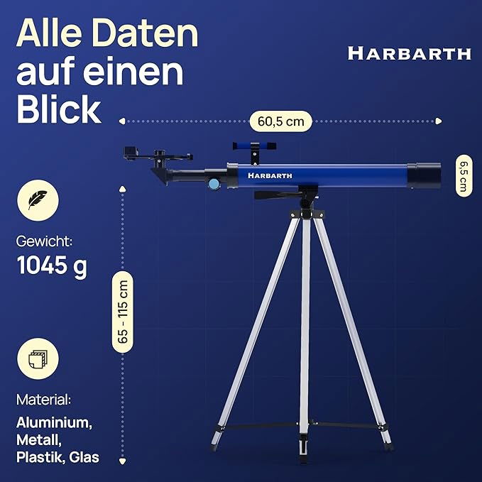 - Stabilny statyw: teleskop można doskonale używać na każdej powierzchni. Dzięki specjalnemu uchwytowi teleskop można swobodnie obracać o 360°. Statyw można swobodnie regulować, polegając na trzech klamrach regulacji wysokości. Dzięki temu potrzeby dorosłych i dzieci w każdym wieku są spełnione. Idealny do znalezienia wygodnej wysokości i optymalizacji wrażeń użytkownika.