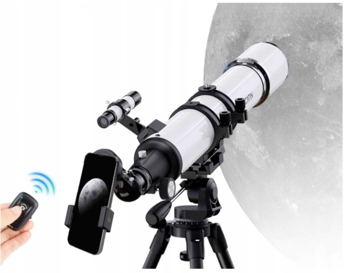 Teleskop jest wyposażony w adapter do telefonu, który pozwala robić imponujące zdjęcia obiektów niebieskich za pomocą smartfona.