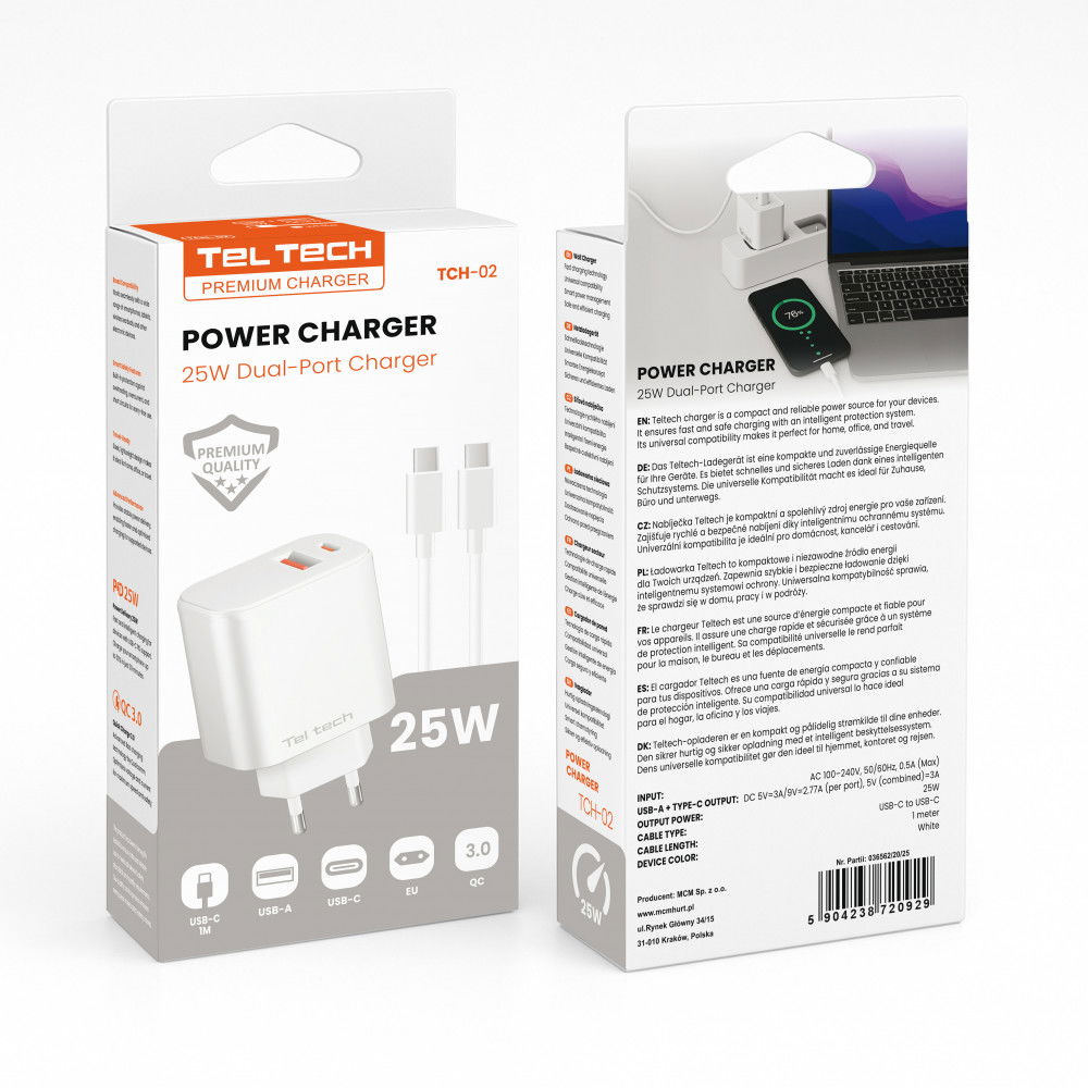 ⭐ TelTech Ładowarka Sieciowa o maksymalnej mocy 25W to idealne rozwiązanie dla tych, którzy potrzebują szybkiego i efektywnego ładowania swoich urządzeń. Wyposażona w porty USB Typ-A i Typ-C, oferuje kompatybilność z szybkim ładowaniem QC oraz PD, które zapewnia niezwykle szybkie ładowanie Twojego sprzętu.