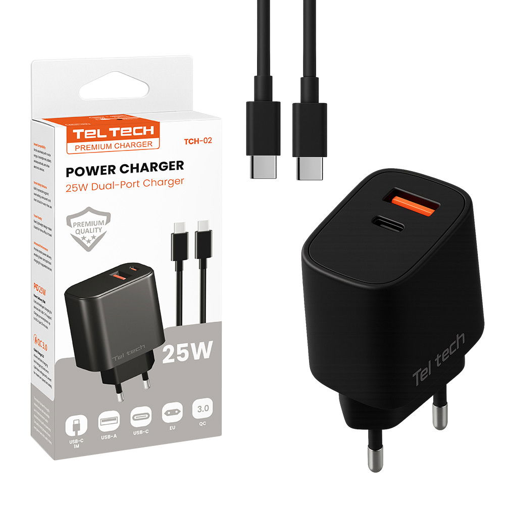 Teltech Ładowarka sieciowa USB / Typ-C 25W + kabel Typ-C - Typ-C 1m czarny TCH-02