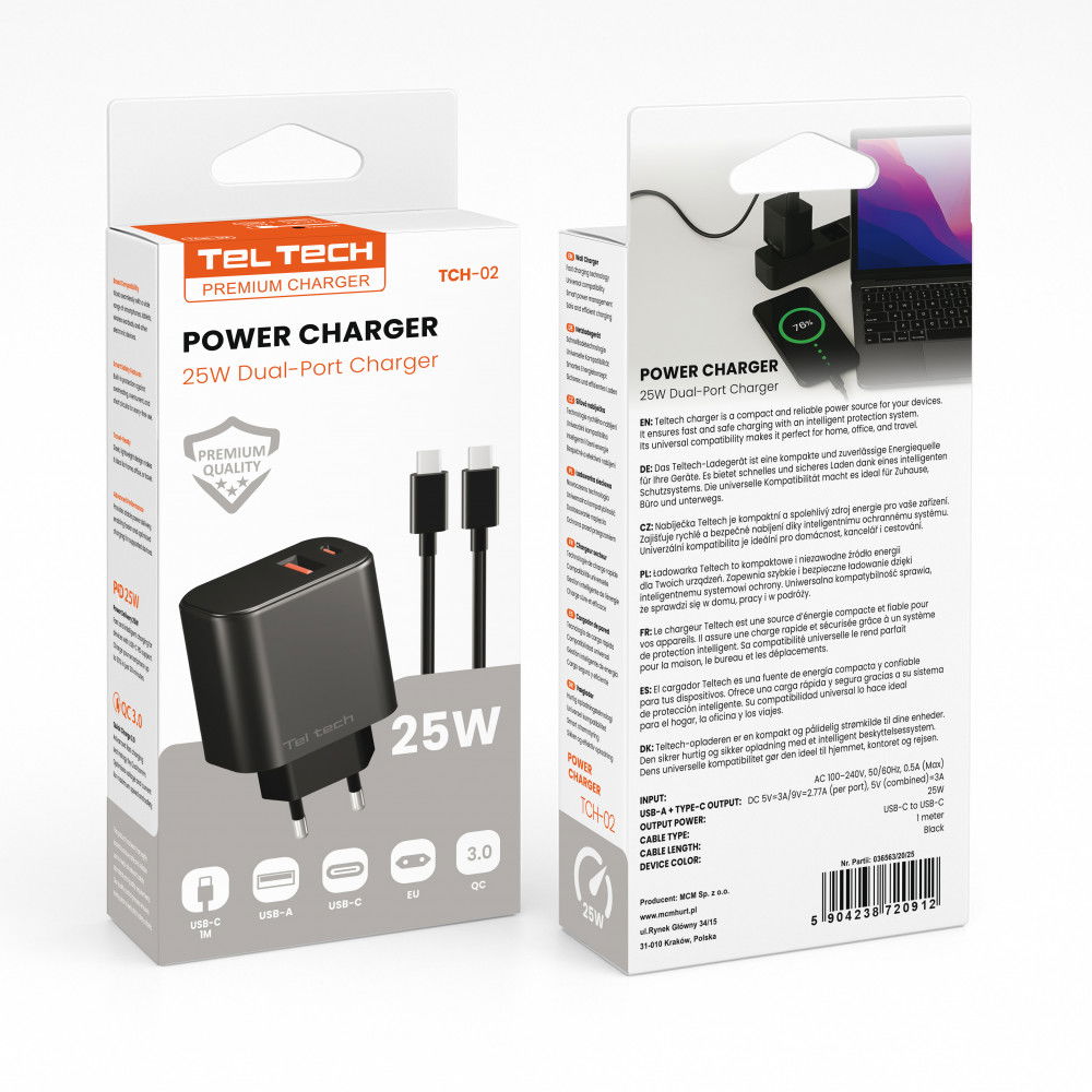 Teltech Ładowarka sieciowa USB / Typ-C 25W + kabel Typ-C -1m czarny TCH-02