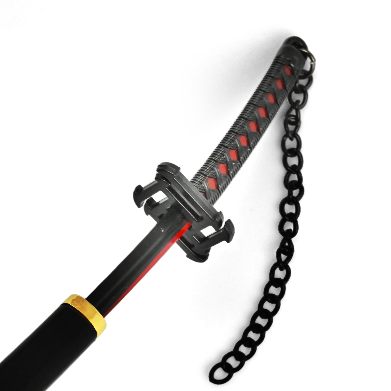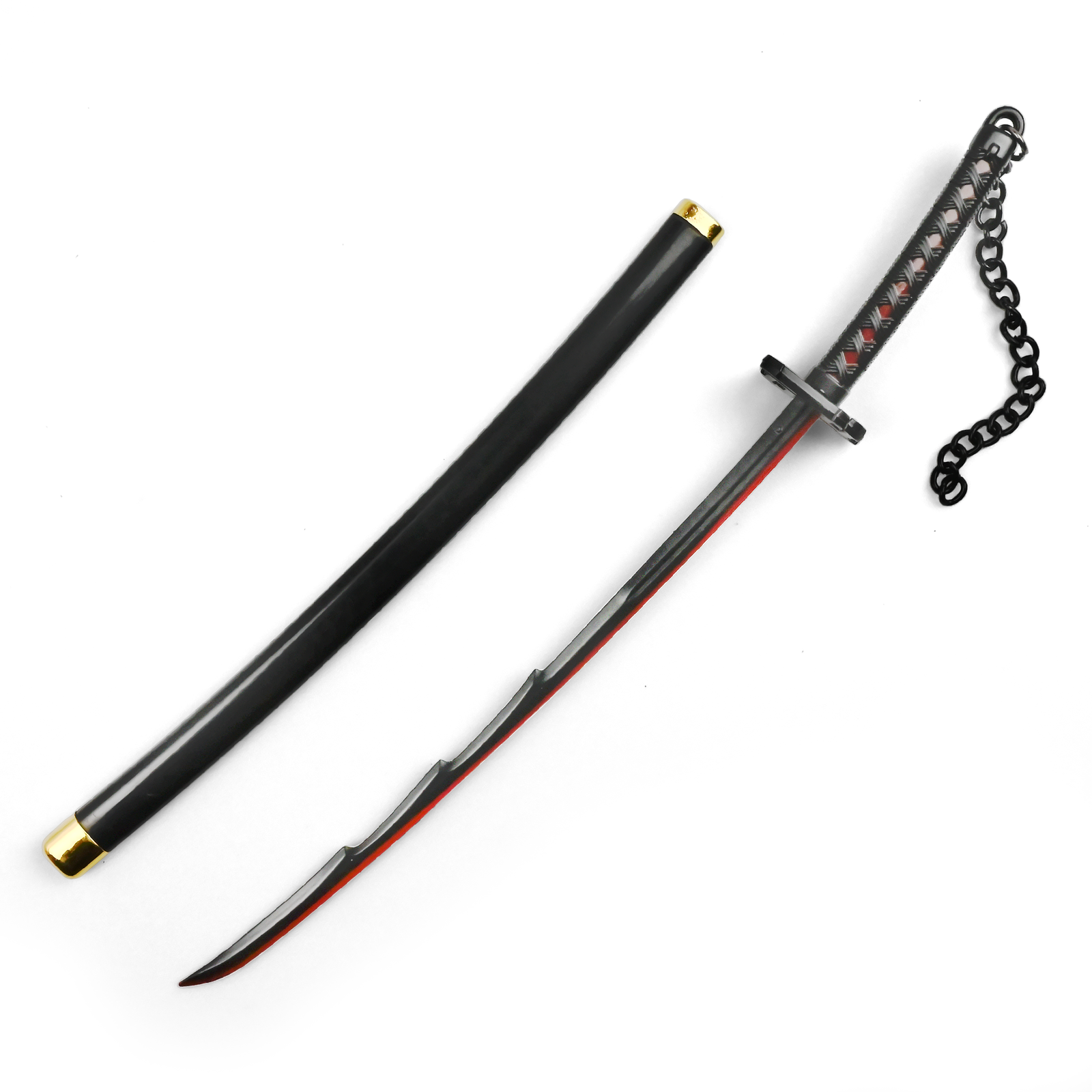 W całości wykonana z metalu katana łączy elegancki minimalizm z dziką energią. Głęboko czarne ostrze z czerwonym rantem przywołuje na myśl duchową siłę i intensywność Ichigo w stanie pełnego przebudzenia. Ząbkowane wgłębienia wzdłuż ostrza podkreślają jego brutalny potencjał bojowy. Rękojeść, owinięta w klasycznym stylu tsuka-maki, wykorzystuje czarno-czerwone akcenty, a z głowicy zwisa masywny, czarny łańcuch—wierne odwzorowanie z anime, dodające dynamiki i symboliki.