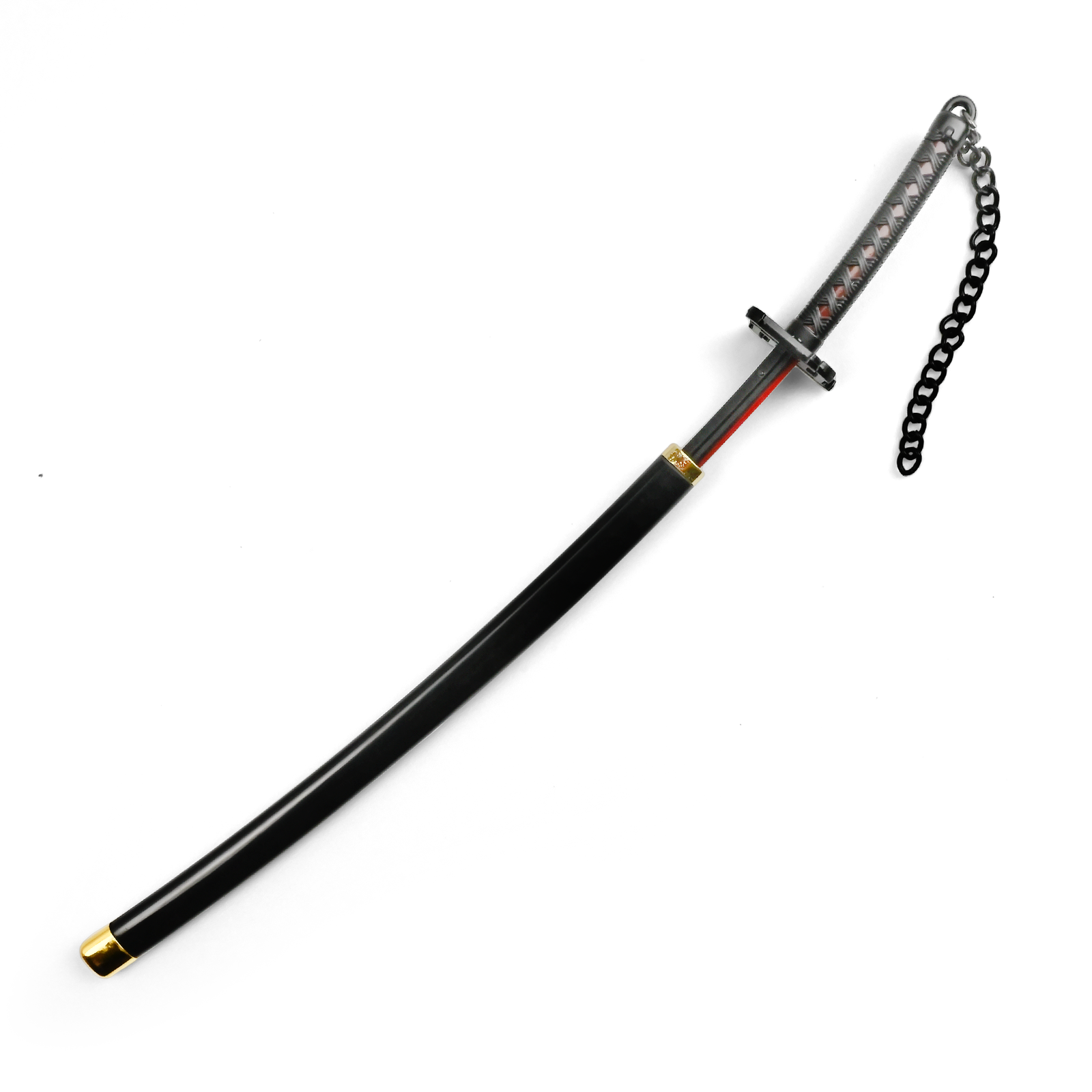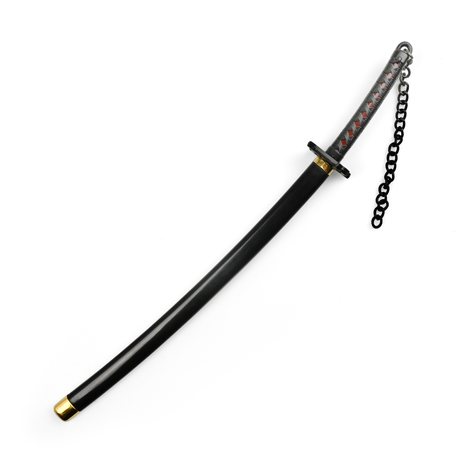 Gładka, czarna pochwa z delikatnymi złotymi zakończeniami kontrastuje z całością, podkreślając estetyczną równowagę. Przy długości 22 cm i wadze 92 gramów katana dobrze leży w dłoni, a zarazem sprawdza się jako ozdoba, brelok czy element cosplayu.