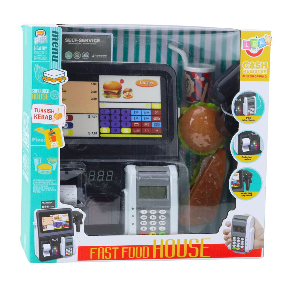 Zanurz się w fascynującym świecie handlu i gastronomii z interaktywnym zestawem Kasa Sklepowa Fast Food House! Realistyczny wygląd, duży ekran z kolorowymi ikonami produktów oraz bogaty zestaw akcesoriów zapewniają niezapomniane doznania podczas zabawy. Skanuj produkty, drukuj paragony, obsługuj terminal płatniczy i wcielaj się w rolę kasjera lub kucharza. Efekty dźwiękowe i świetlne dodają dynamiki, a liczne funkcje wspierają rozwój wyobraźni i koordynacji ruchowej. Zestaw zawiera kasę, terminal POS, skaner, elementy jedzenia i napój. Doskonały zarówno do domu, jak i przedszkola. Odkryj nowy wymiar zabawy i nauki dzięki Kasa Sklepowa Fast Food House!