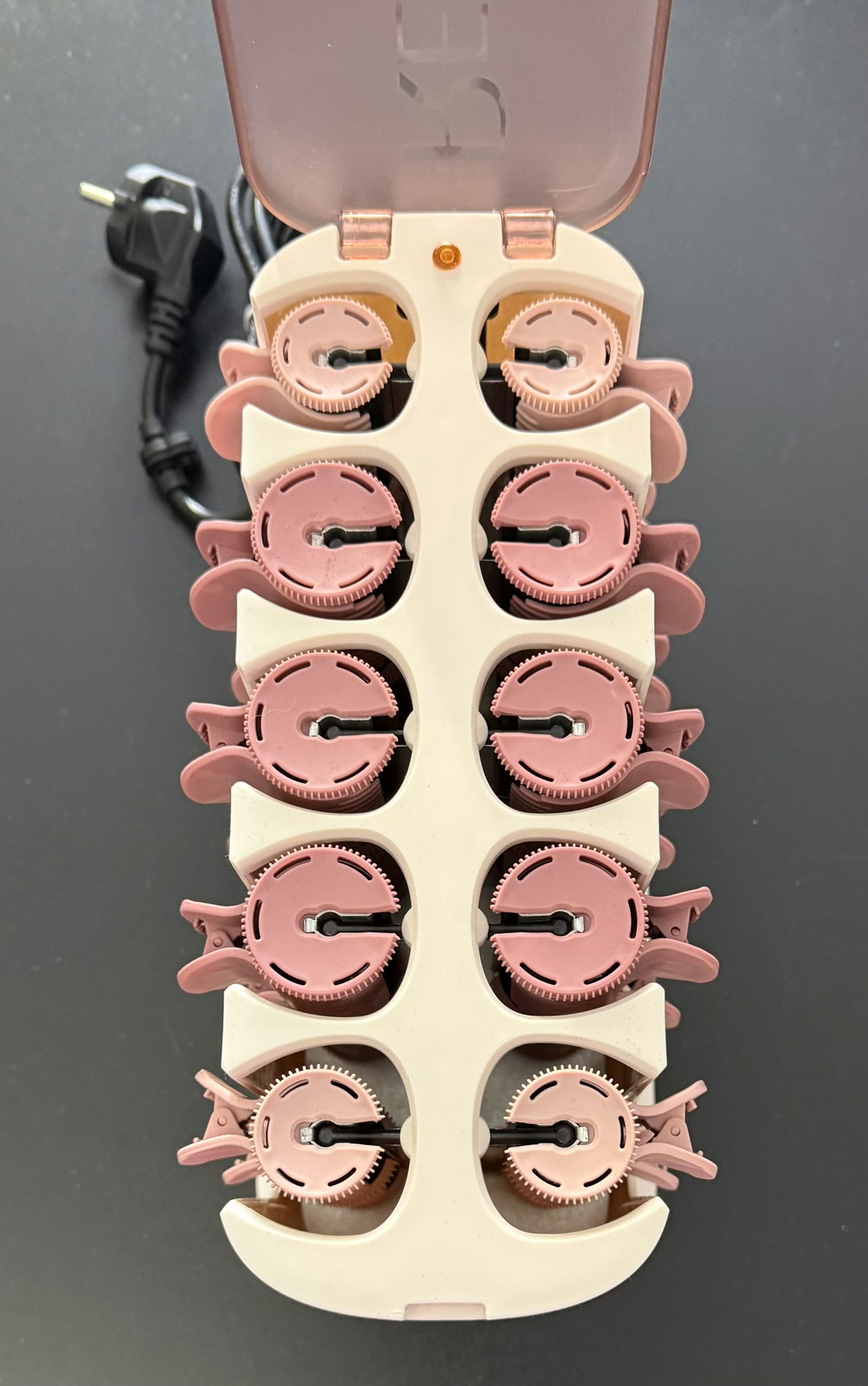 Zestaw zawiera 20 welurowych wałków w dwóch rozmiarach: 8 średnich (25 mm) i 12 dużych (32 mm), co daje możliwość tworzenia różnych stylizacji – od delikatnych fal po objętościowe loki. Ceramiczne, nagrzewające się klipsy pomagają utrwalić skręt i zapobiegają elektryzowaniu włosów.