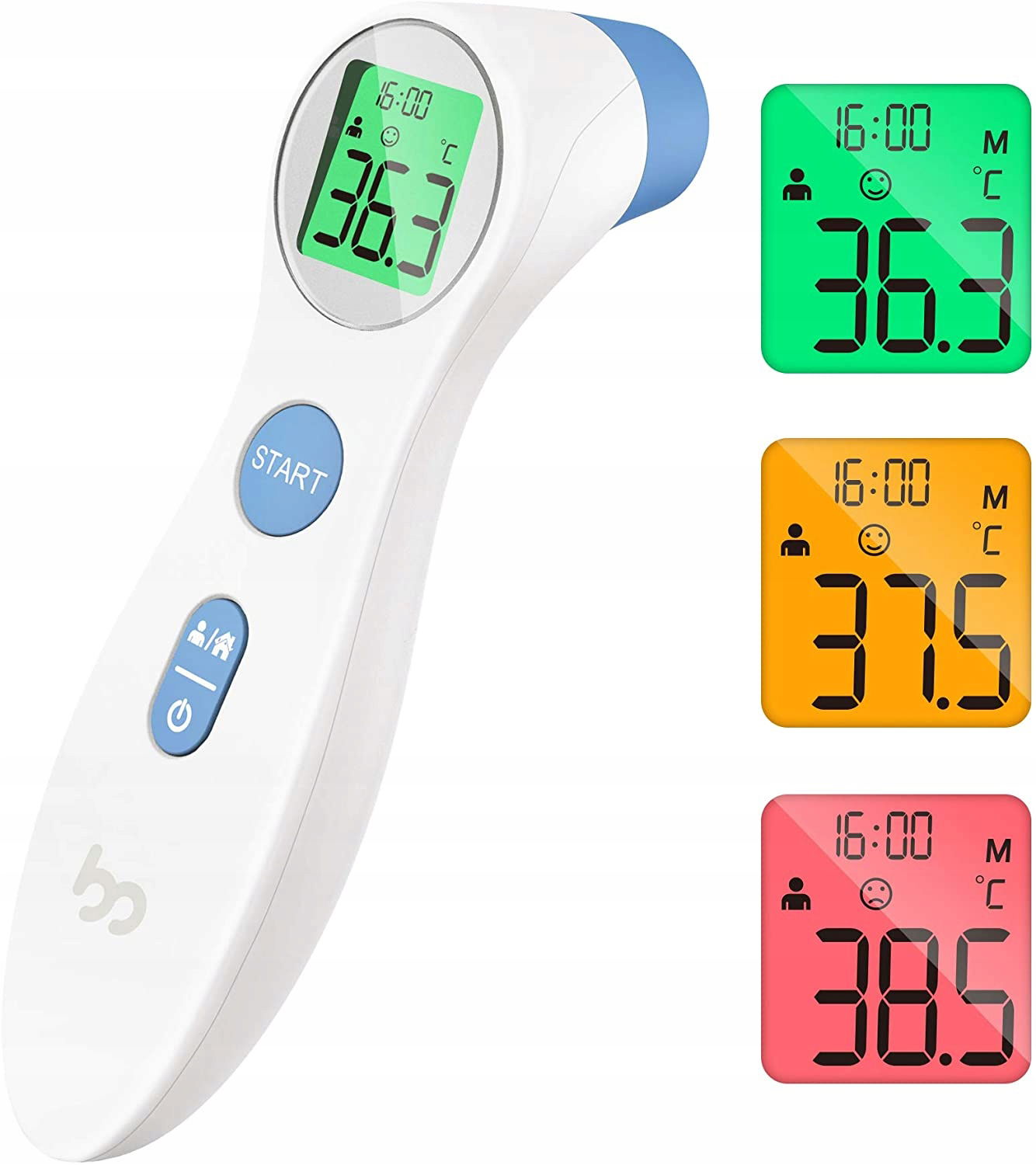 3 kolory wyświetlacza wskazują poziom temperatury (wynik poniżej 37,3°C - kolor zielony, wynik w przedziale 37,3 - 37,8°C - kolor żółty, powyżej 37,8°C - kolor czerwony).